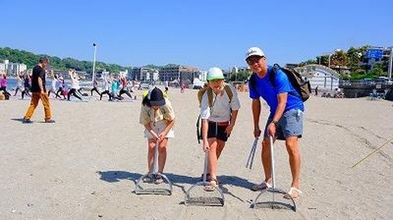 海で遊ぶ時に引き波に注意することなどの勉強会、トングと「海と日本プロジェクト・CHANGE FOR THE BLUE」のごみ袋を貸し出して全員でビーチクリーン、その後海洋ごみはどこから来るのかの勉強会を実施いたしました。今年で5年目となるこの活動ですが、今年は砂の中のごみを掘り起こす「ゲットング」を開発、ビーチをゲットングで引いていくと網にプラスチックごみなどが入り込む新兵器で子どもたちに楽しくプラスチックごみの回収をしてもらいました。