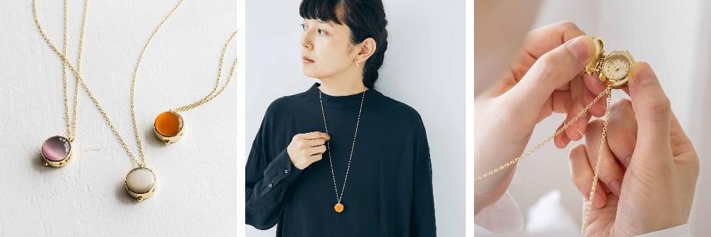 アクセと時計がひとつでふた役。月のように胸もとできれいに輝く美しいデザイン。ふたを開けば時間をお知らせ。腕時計だと気になる、手洗いや長袖に隠れるわずらわしさも解消。華やぎと便利さを兼ね備えたペンダントウォッチです。