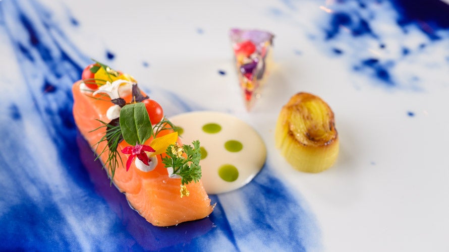 季節の鮮魚のサクラマスを低温でミキュイに仕上げたオードブル。