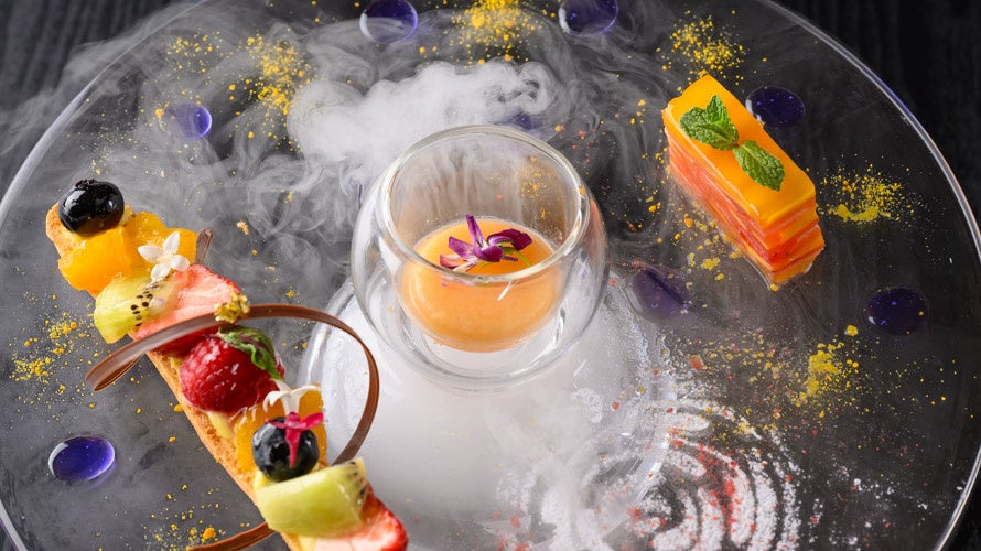ミルフィーユ仕立てと数種類のフルーツを自家製のシューで包み込んだエクレアを