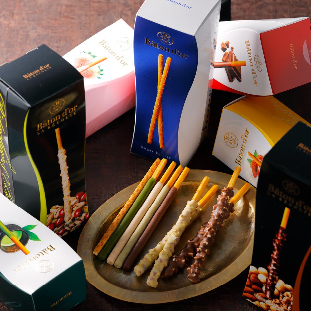 バトンドールとはフランス語で「黄金のスティック」のこと。その黄金色に光り輝くスティックは、バターをふんだんに練り込んだ生地をじっくりと焼き上げ、澄ましバターとシュガーのシャワーをくぐらせて創り上げた、バターリッチなプレッツェルです。
