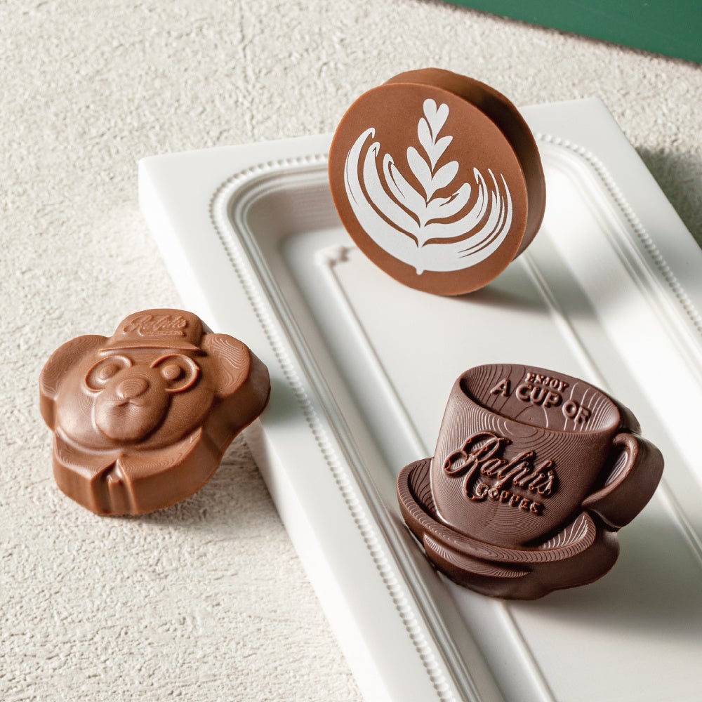 アパレルブランド〈ラルフ ローレン〉の世界がチョコレートに。タイムレスなアメリカンスピリットを感じるコーヒーショップ〈ラルフズ コーヒー〉の象徴「ラルフズカップ」と「バリスタベア」型に、「ラテアート」柄を描いたチョコレートを加えた3種入り。キャラメル・ビター・ヘーゼルナッツ味が楽しめます。