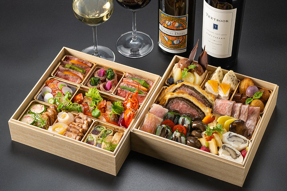 大切な方とのかけがえのない時間を、より一層特別なひとときに彩るフレンチコース二段重は、これからの季節に増えるお集りにもおすすめです。また、オプションで購入できるソムリエ厳選のワインもご用意しています。総料理長 中埜が海と大地と自然の恵みへの畏敬の念を忘れず、そして自身の感受性を広げながら、渾身の力を込めてもてなす美食の数々をお楽しみください。