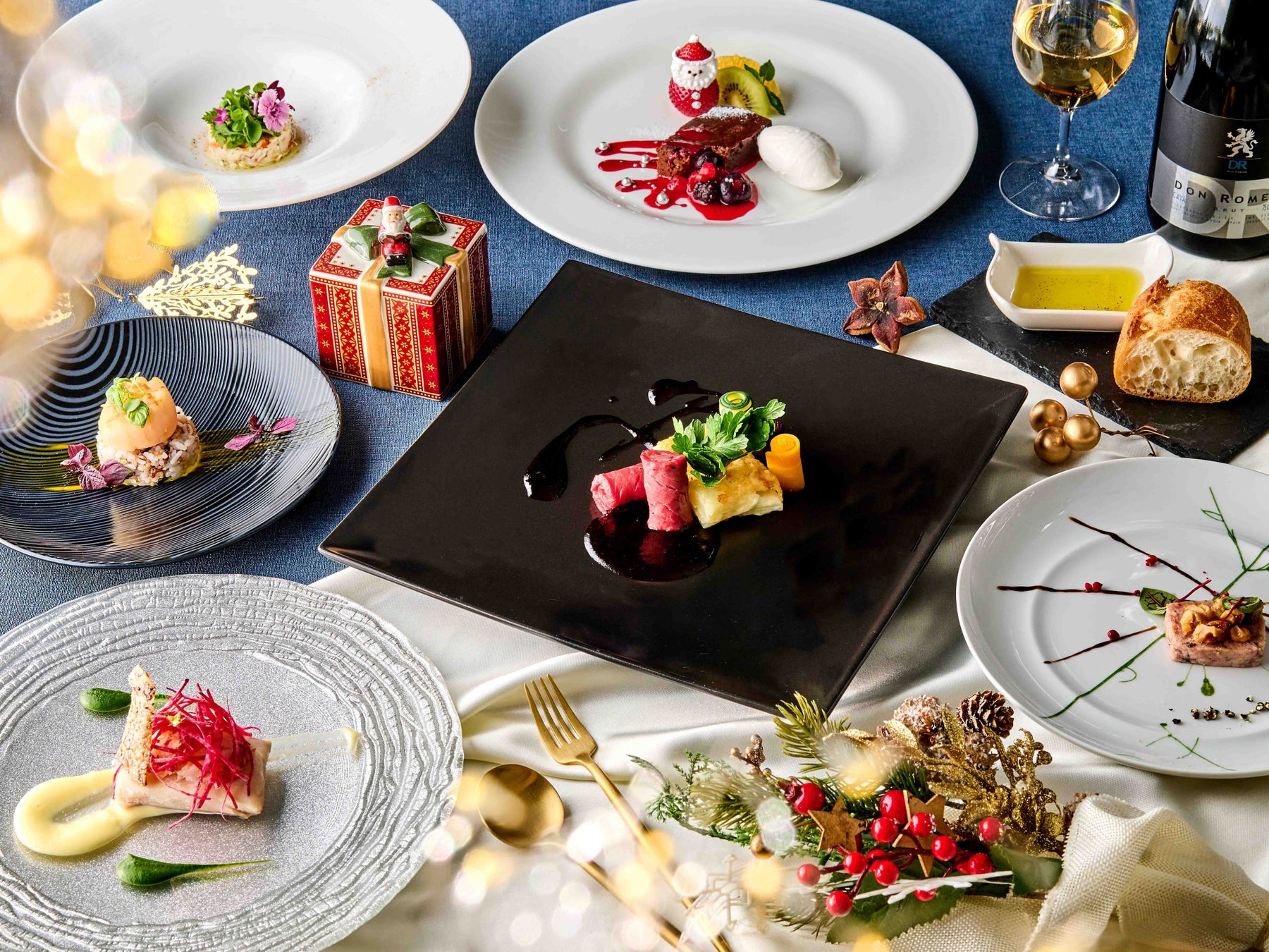 コース一品目は、乾杯のスパークリングワインと楽しむ「ポークプロパンサル バルサミコ酢のアクセント」。前菜には、ホタテの甘さとチーズの風味豊かな「ホタテのグリル 十五穀米とキヌアのリゾットで」と、オレンジやケッパーも使用した爽やかなソースが香る「タラバガニのタルタル バジルと山椒の香り」の2種類をお楽しみください。続く魚料理には、鮮やかなビーツの下に贅沢な食材を組み合わせた「オマール海老の低温調理と真鯛の白ワインソース ノエル仕立て」を。肉料理には、柔らかな肉質とトリュフソースが食欲をそそる「国産牛のローストビーフ ポテトのグラタントリュフの香り」と豪華なラインナップ。デザートには、ショコラの華やかな味わいが口いっぱいに広がる「ショコラベリーテリーヌ バニラアイスクリームのハーモニー」をご用意いたしました。