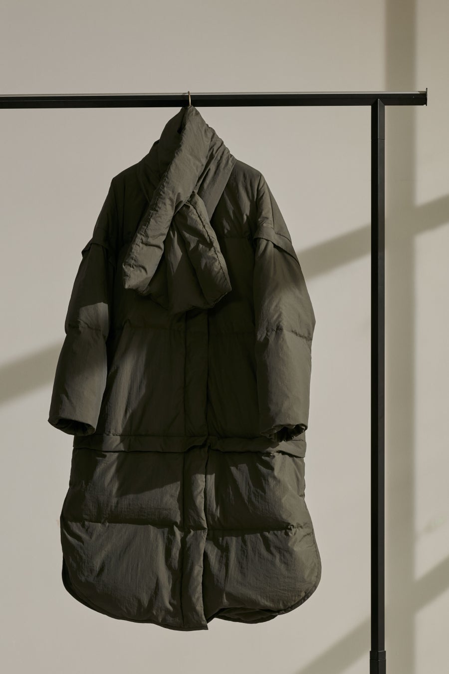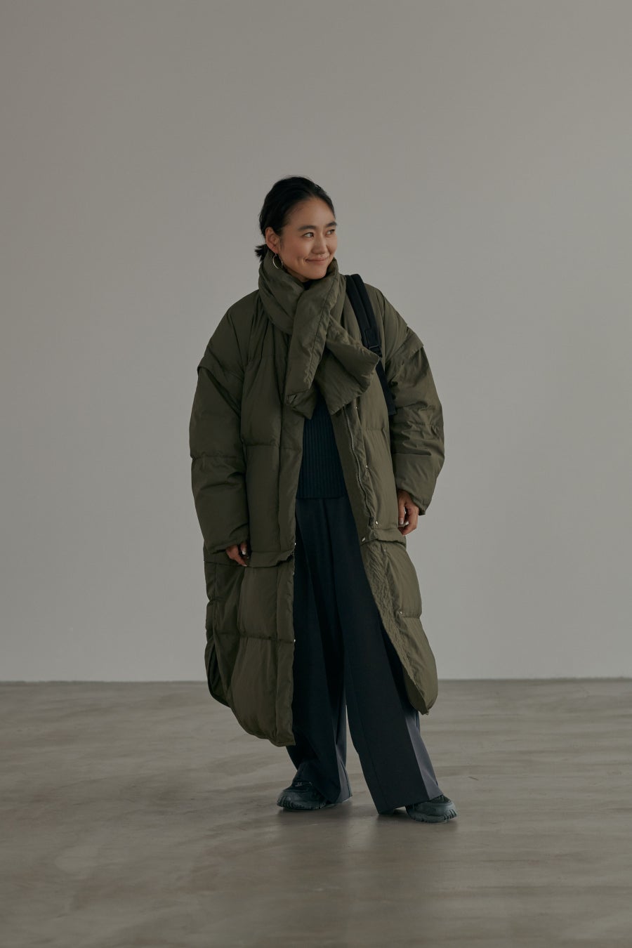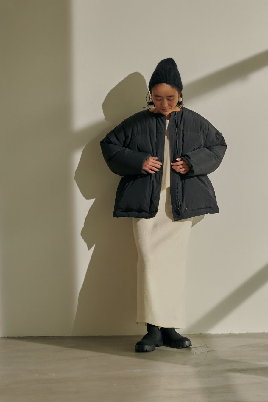 “今年の冬は白多めなスタイルが流行るので、裾を取り外して短くし、一番よく着てもらえる形の黒ダウンをオールホワイトのスタイルに合わせてみました。襟元や後ろ姿も様になるフォルムなので、華やかなスタイルにも気負わず羽織りやすいと思います。ロングスカートにも合わせやすい丈なので、甘くなりすぎず奥行きのある印象に仕上がります”