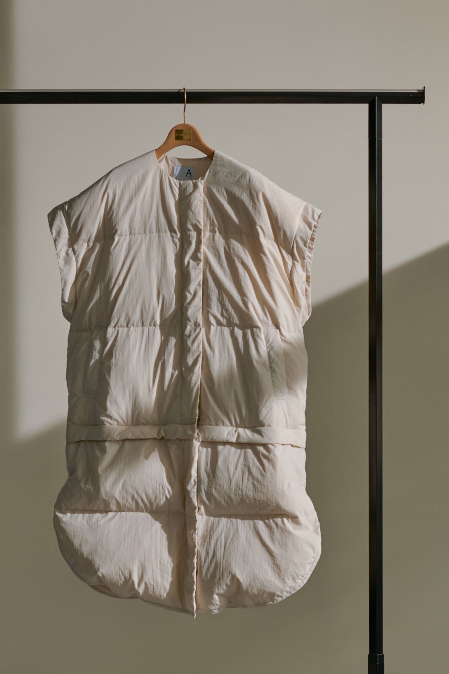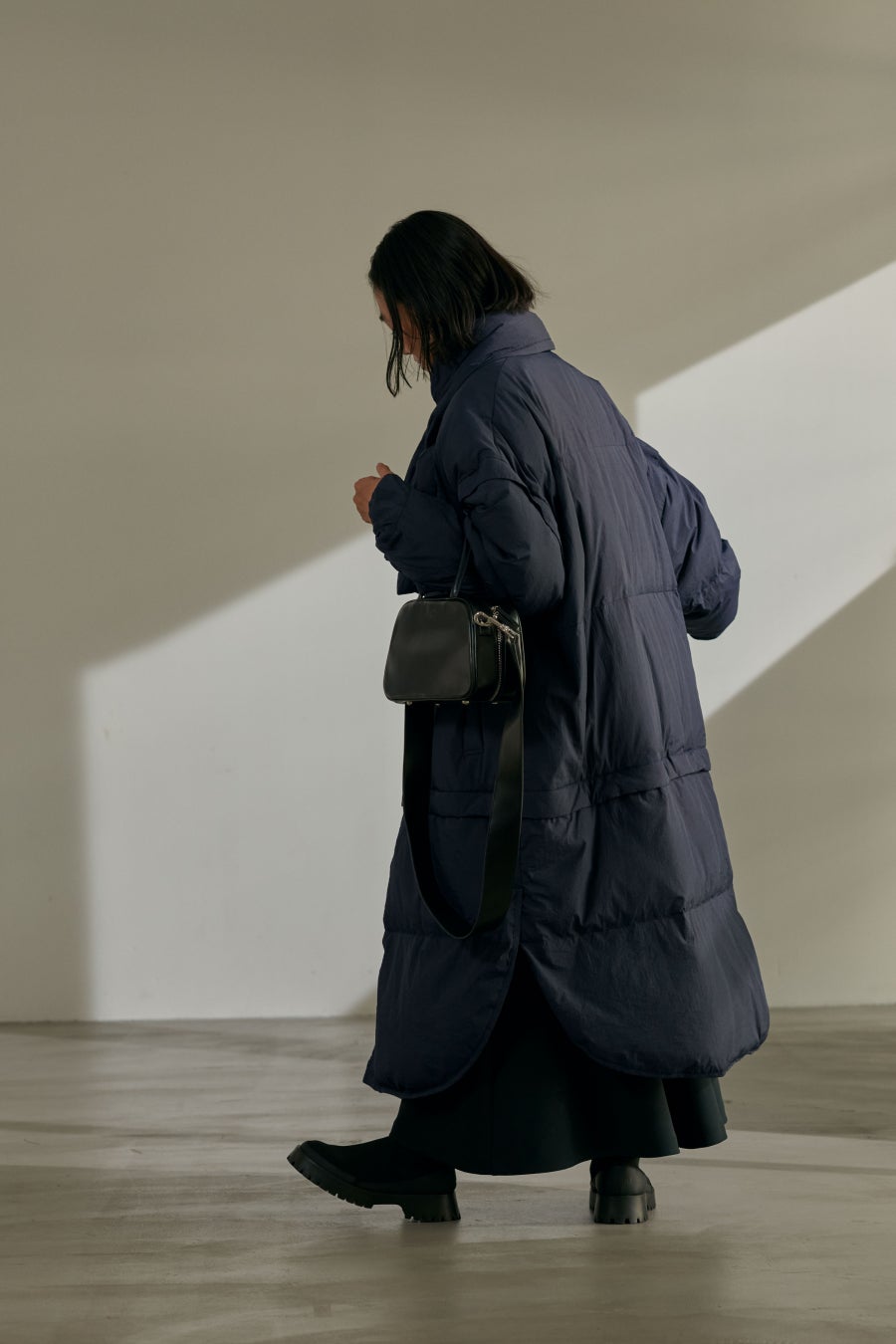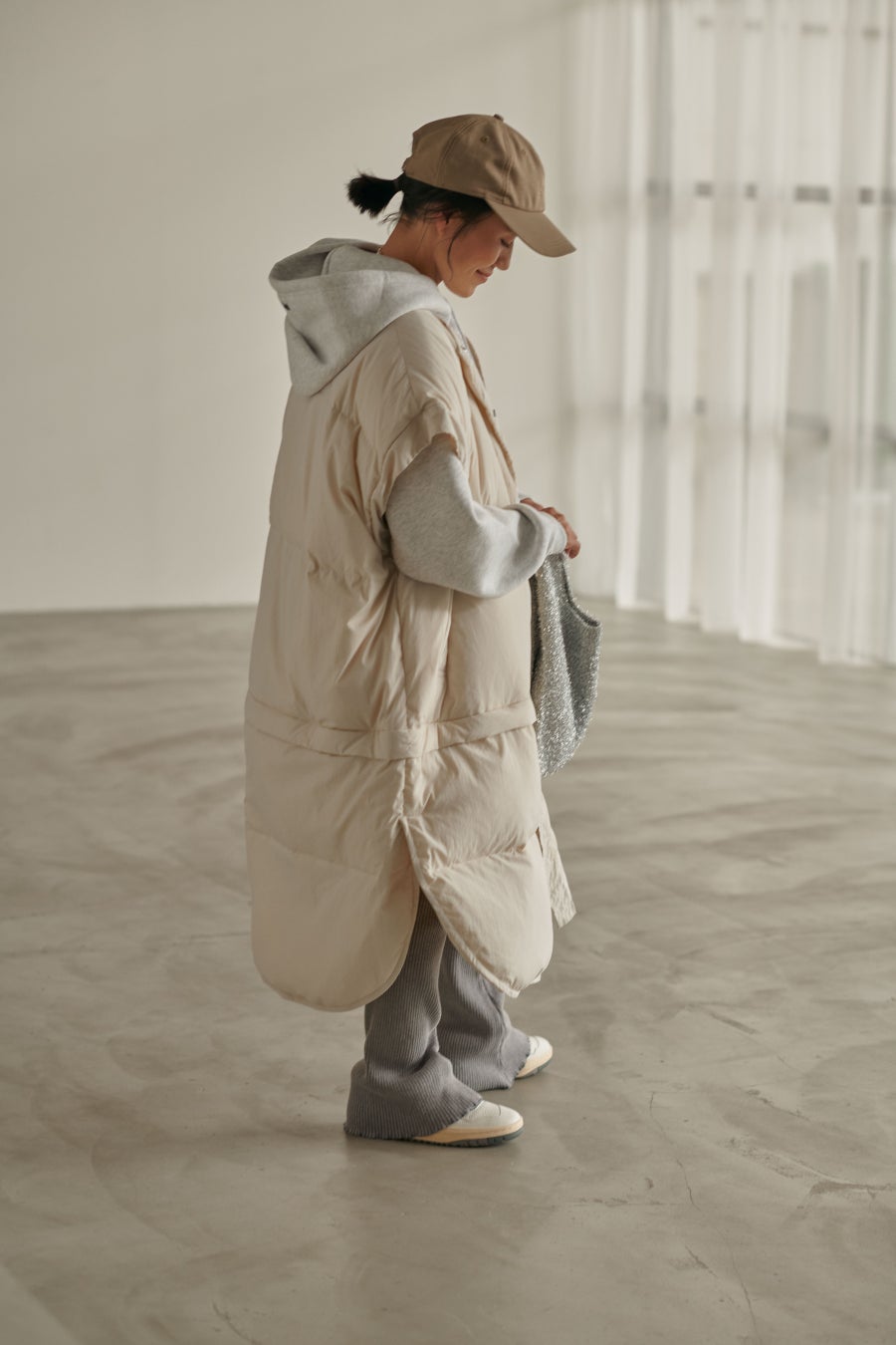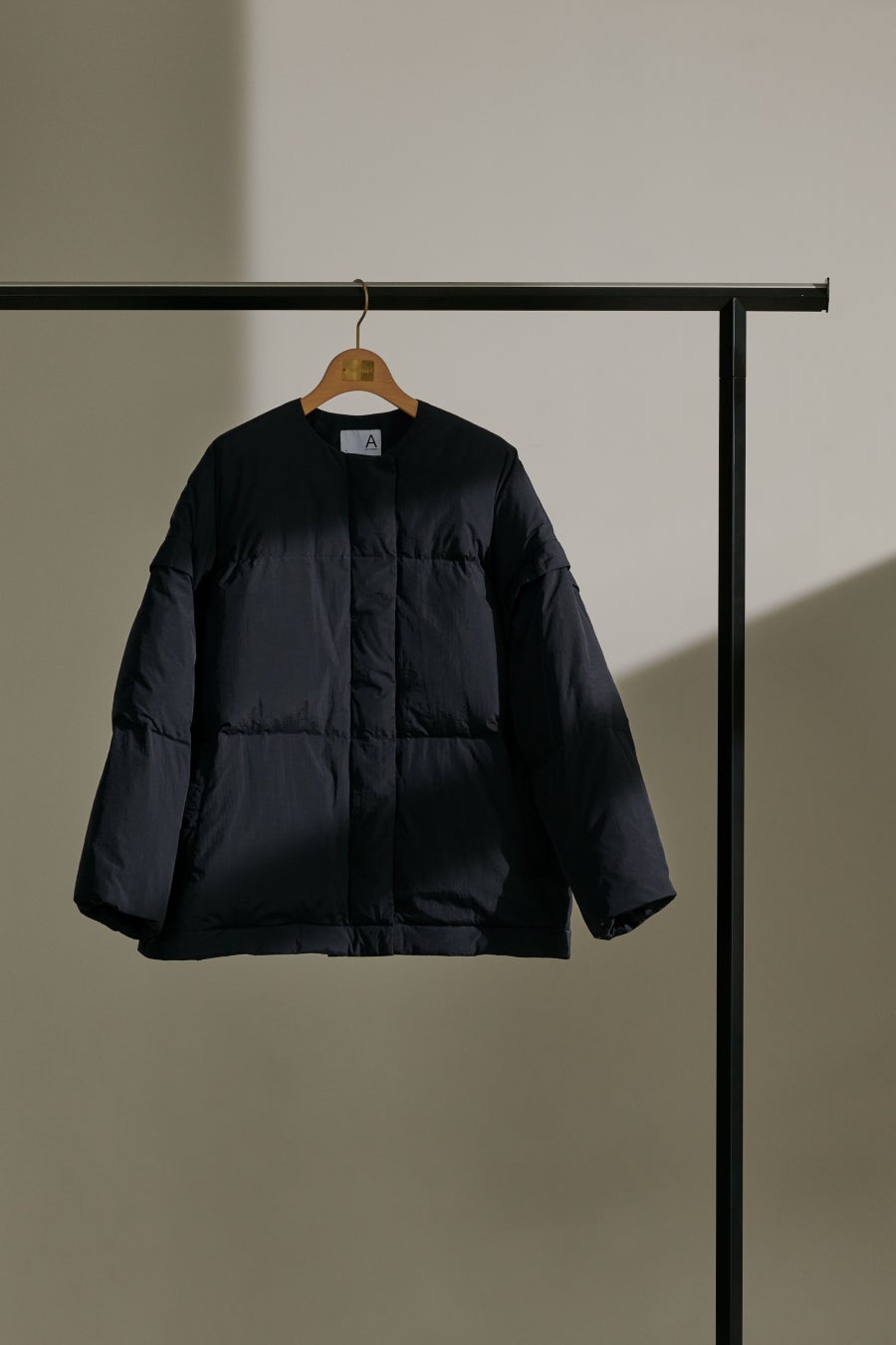 “今年の冬は白多めなスタイルが流行るので、裾を取り外して短くし、一番よく着てもらえる形の黒ダウンをオールホワイトのスタイルに合わせてみました。襟元や後ろ姿も様になるフォルムなので、華やかなスタイルにも気負わず羽織りやすいと思います。ロングスカートにも合わせやすい丈なので、甘くなりすぎず奥行きのある印象に仕上がります”