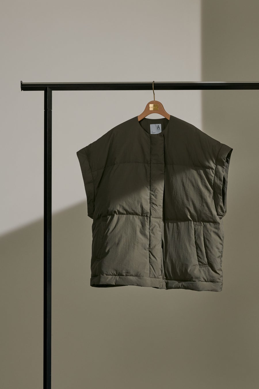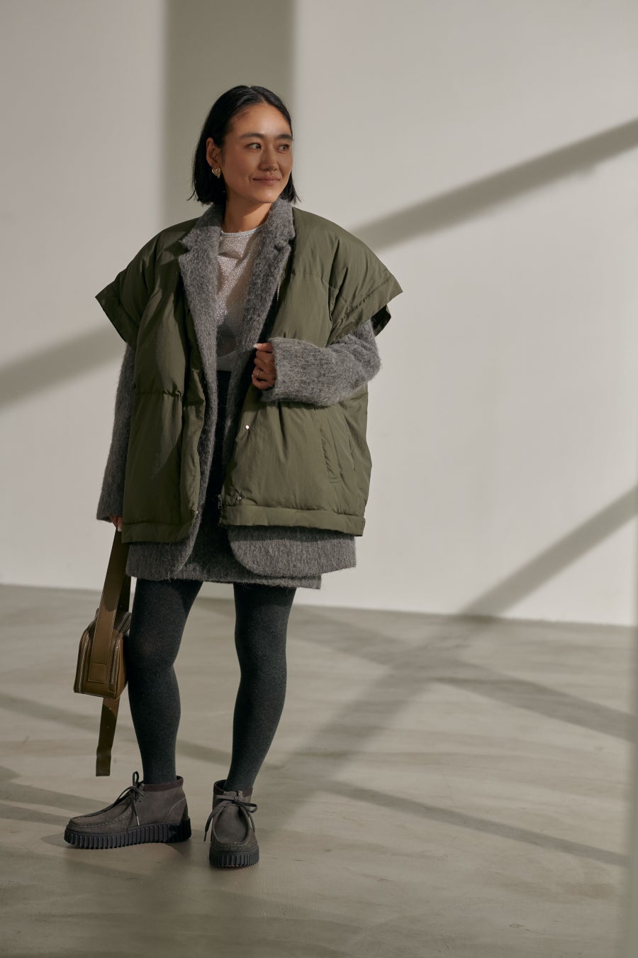 “袖、裾をオフして一番コンパクトな形にし、保温性の高いジャケットの上にダウンを羽織った今年らしいミニスタイル。ベストのアームホール部分が広いので、ボリュームのあるアウターの上にも重ねやすく、裾の下からジャケットが覗く様も絶妙。emmi オリジナルのマットな平編みタイツの履き心地も抜群なので、ミニに挑戦したい方にはこちらもおすすめです”