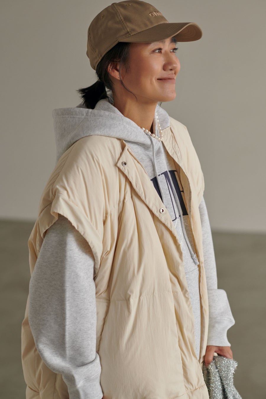 “フーディー+ニットパンツのスポーティなアイテムに、アイボリーのダウンを重ねたヘルシーなスタイル。この色は一番甘い印象になるので、カジュアル寄りのスタイルでも大人に引き寄せてくれるんです。肌映りもいいので、大人の女性には一番おすすめのカラー。さらにパールネックレスとスニーカー、バッグもキラキラにして、発光盛りにしてみました”