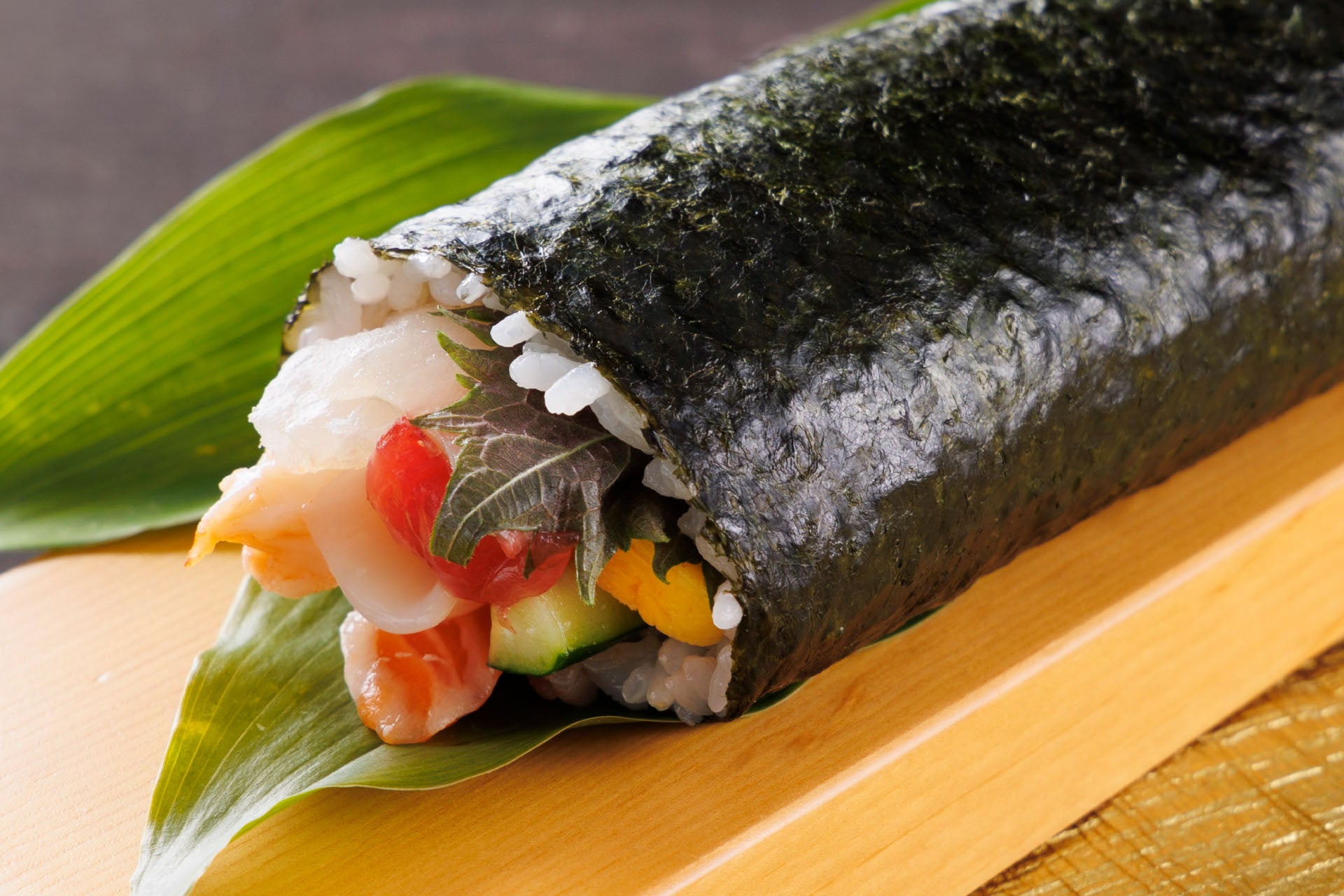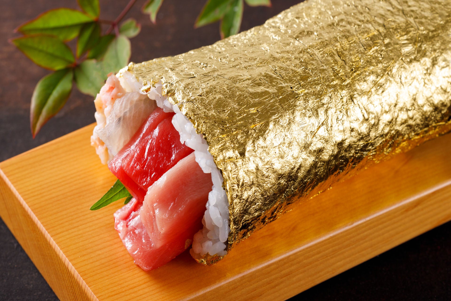 \初登場/ 生本マグロ・大トロ・中トロ・車エビ・ズワイガニ・シマアジに当日入荷の天然もの(お楽しみに)を、金箔で巻いた金の恵方巻きを令和7年にちなんで7本限定販売!