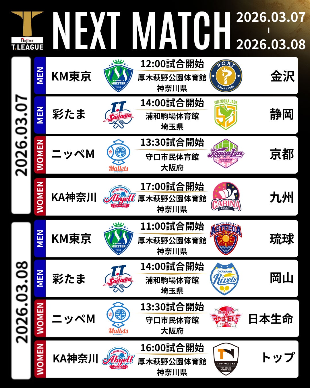 2位の金沢は直接対決となる土曜のKM東京戦の勝利は絶対条件。土曜に勝利をあげれば勝利数でKM東京を上回る為、翌日のKM東京vs琉球戦にKM東京が敗れればレギュラーシーズン1位となる可能性が出てくる。現在、17勝とシングルス勝利数1位の谷垣佑真が今シーズン幾度となく発揮してきた勝負強さをここ一番でも見せることが出来るだろうか。
