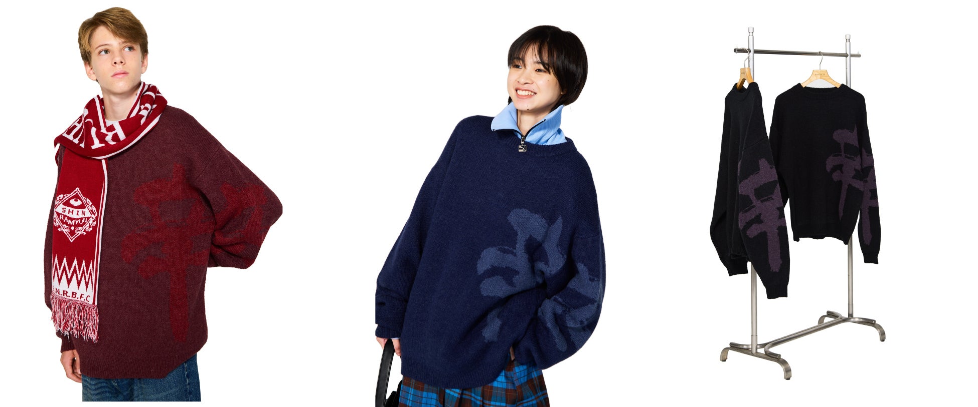 今回のコラボアイテムは秋冬らしい、“辛”の文字を組み込んだオリジナルのノルディック柄のデザインと象徴的な”辛”ロゴをあしらったデザインのニット2型と「辛ラーメン」製品のパッケージを並べたプリントデザインと「辛ラーメン」ブランドグローバルキャッチコピーの「Spicy Happiness In Noodles」を着こなしやすく落とし込んだスウェット2型、昨今トレンドのフットボールマフラーをベースにしたマフラー1型の男女問わず着用できる合計5型をラインアップ。