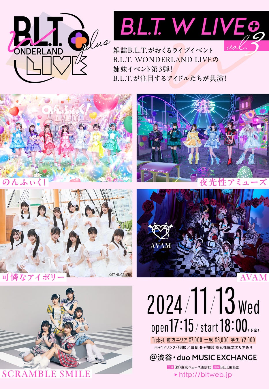 「B.L.T. W LIVE + vol.3」が11/13開催。のんふぃく!/夜光性アミューズ/可憐なアイボリー/AVAM/SCRAMBLE SMILEが出演!