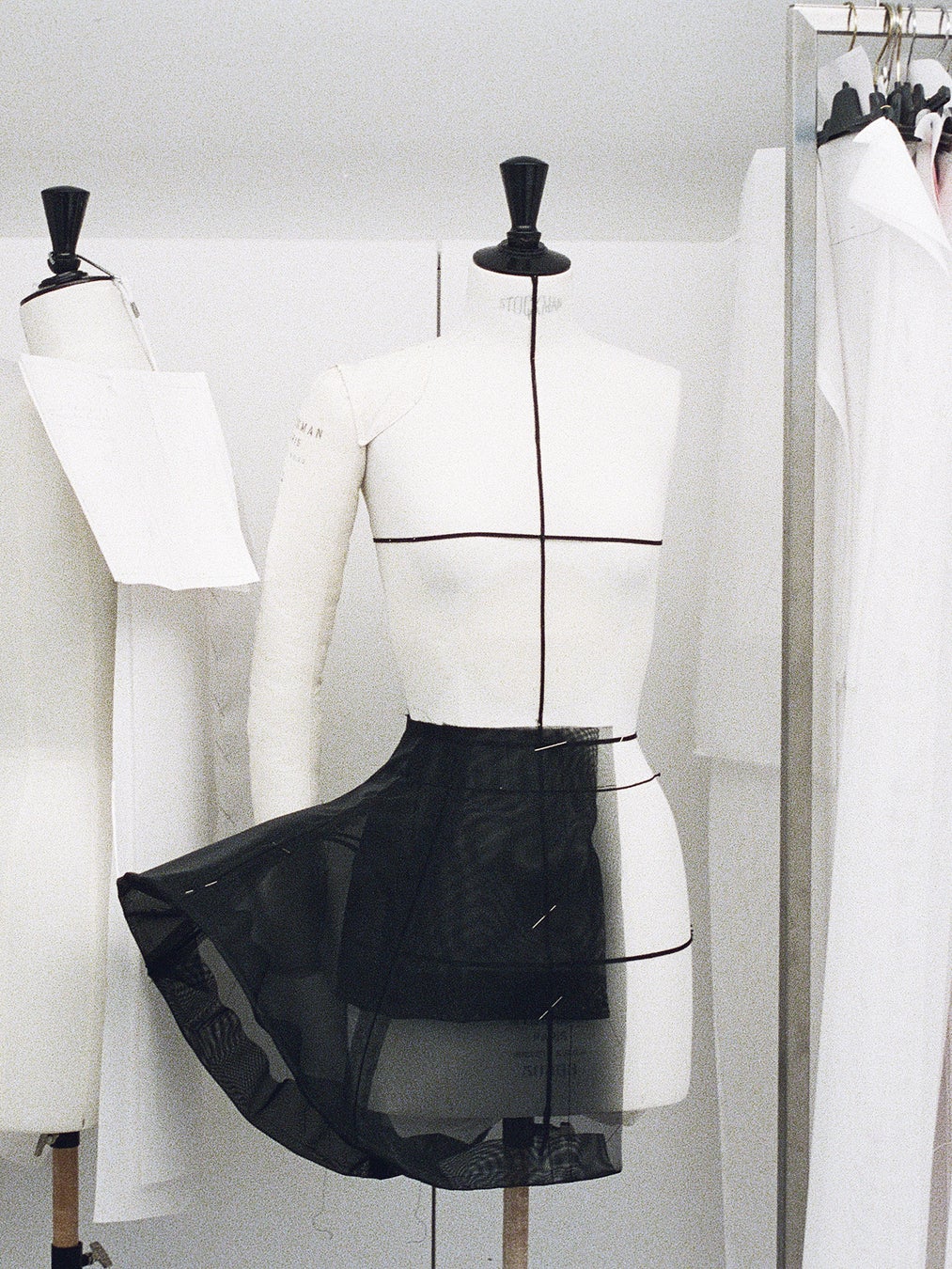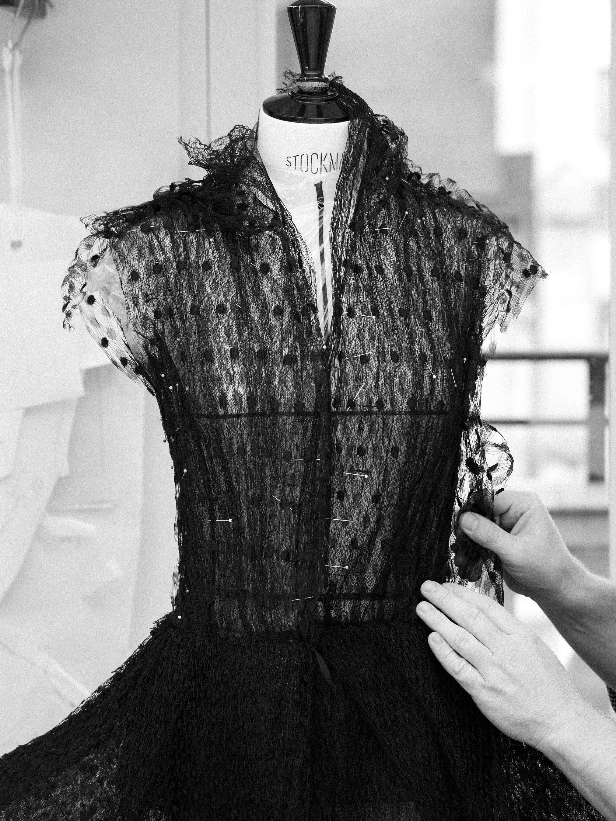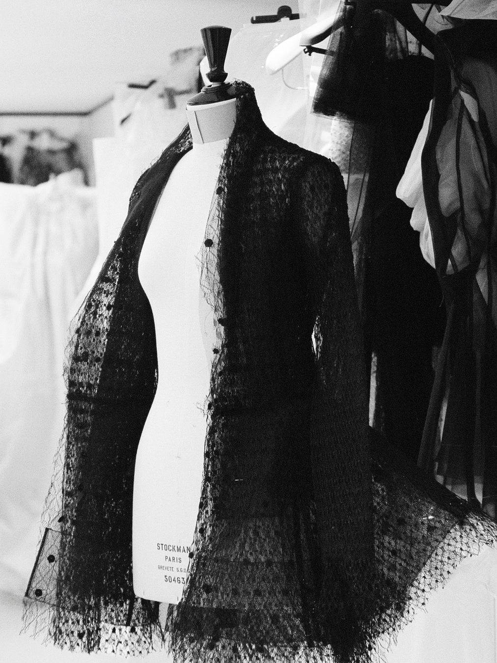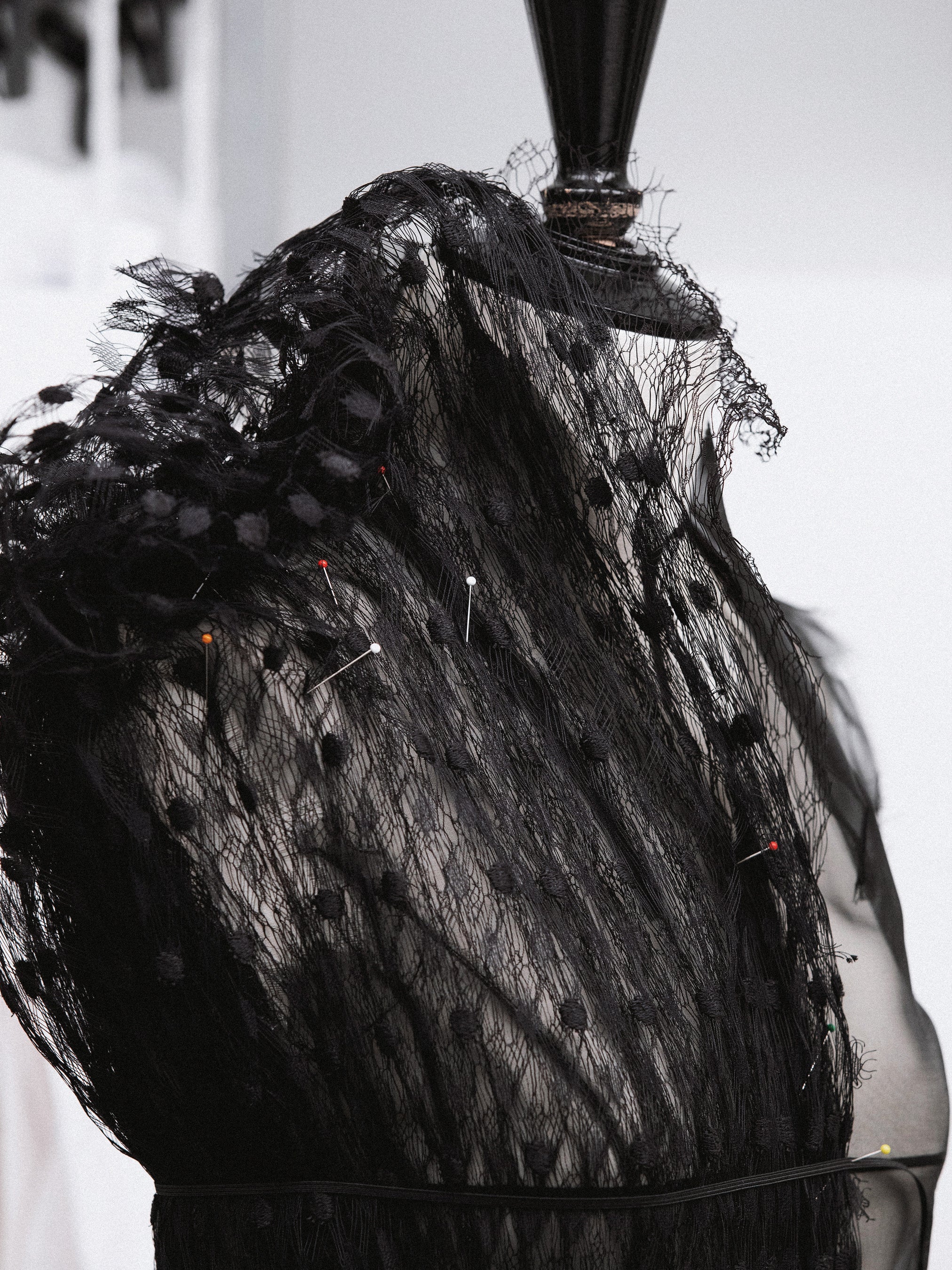 エミリー・ブラントは、2026年春夏 オートクチュール コレクションより、フレア状のホースヘアペプラムをあしらった構築的なジャケットドレスを着用しました。5種類の異なるネットを重ねることで、ブラックツイードのような効果を生み出しています。
