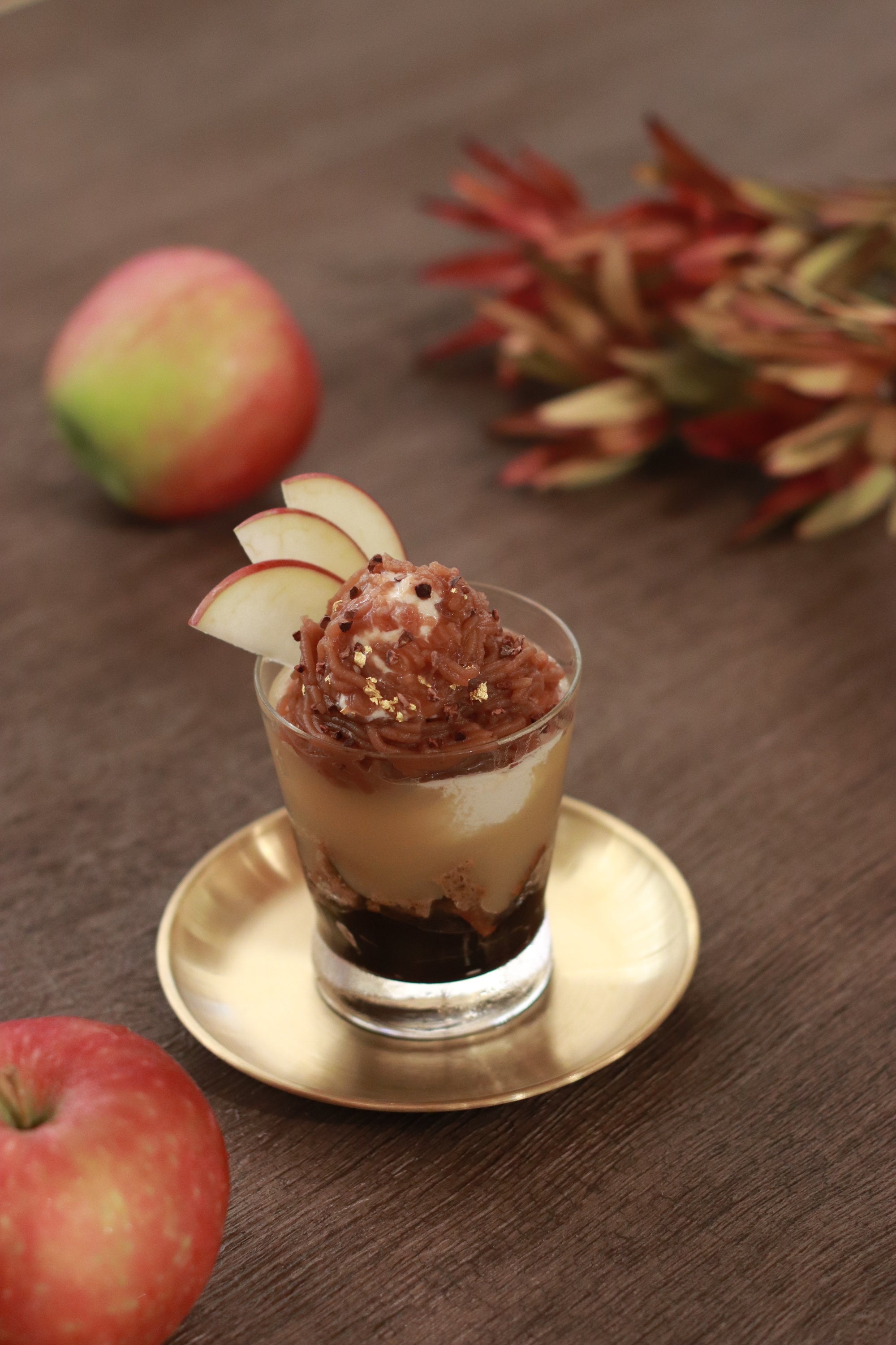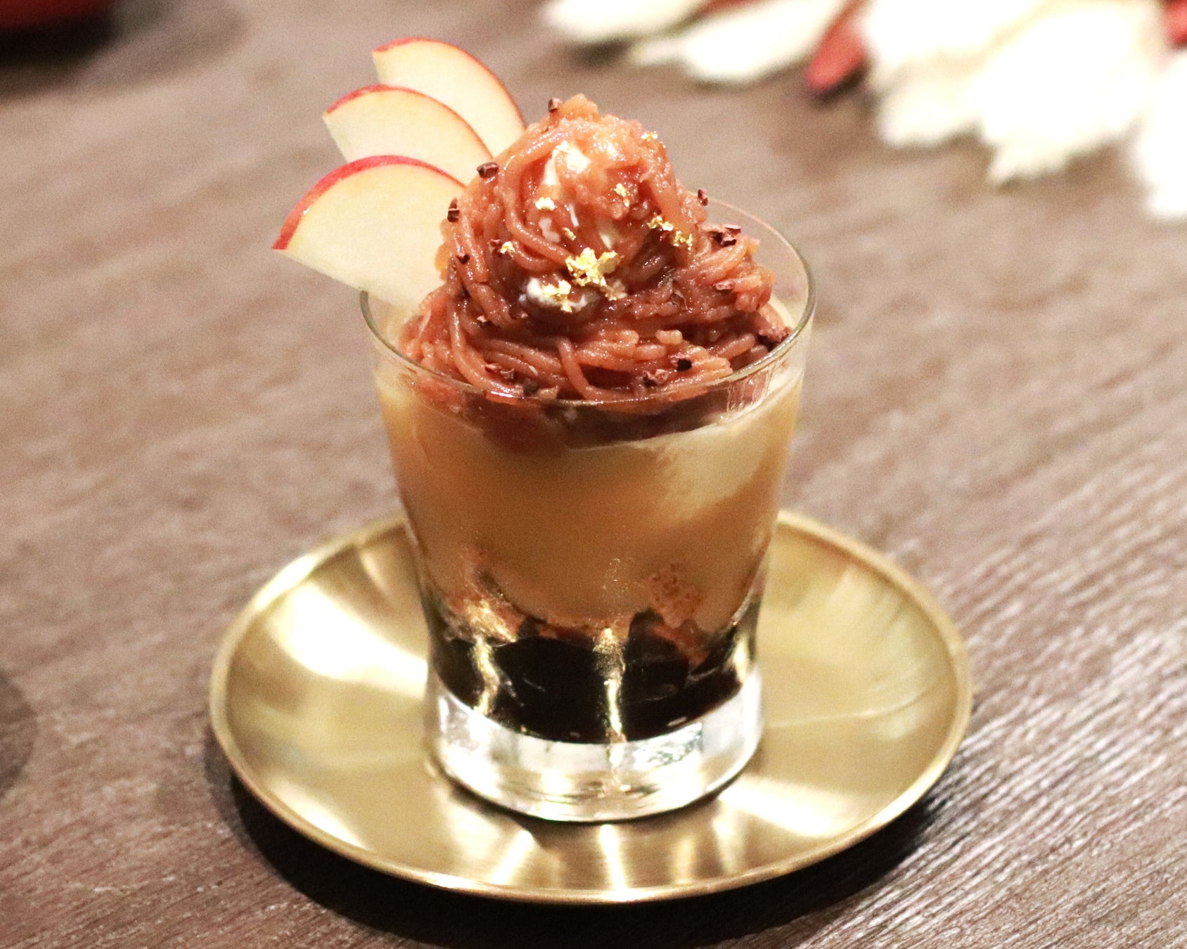 濃厚な栗のペーストと甘酸っぱさが魅力のりんご、そしてトップにあしらう金箔が秋の訪れを感じさせる、大人なパフェです。