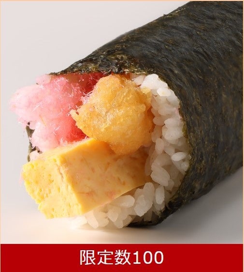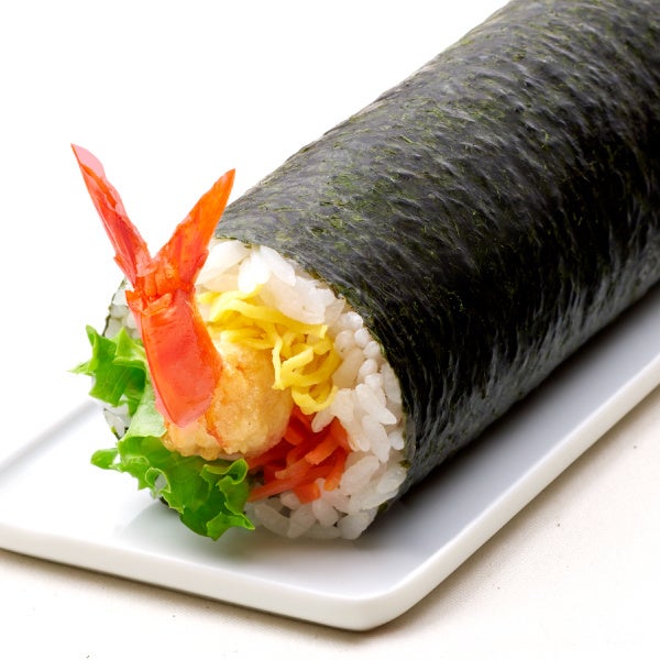 揚げたての海老天と特製のかえし丼つゆ味のごはんを炙り海苔と大葉で巻きました。