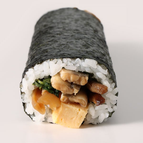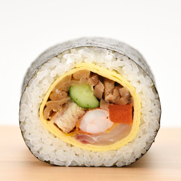 七種類の具材(干瓢・椎茸・海老・にんじん・穴子・厚焼き・山せり)が入った人気の太巻きです。