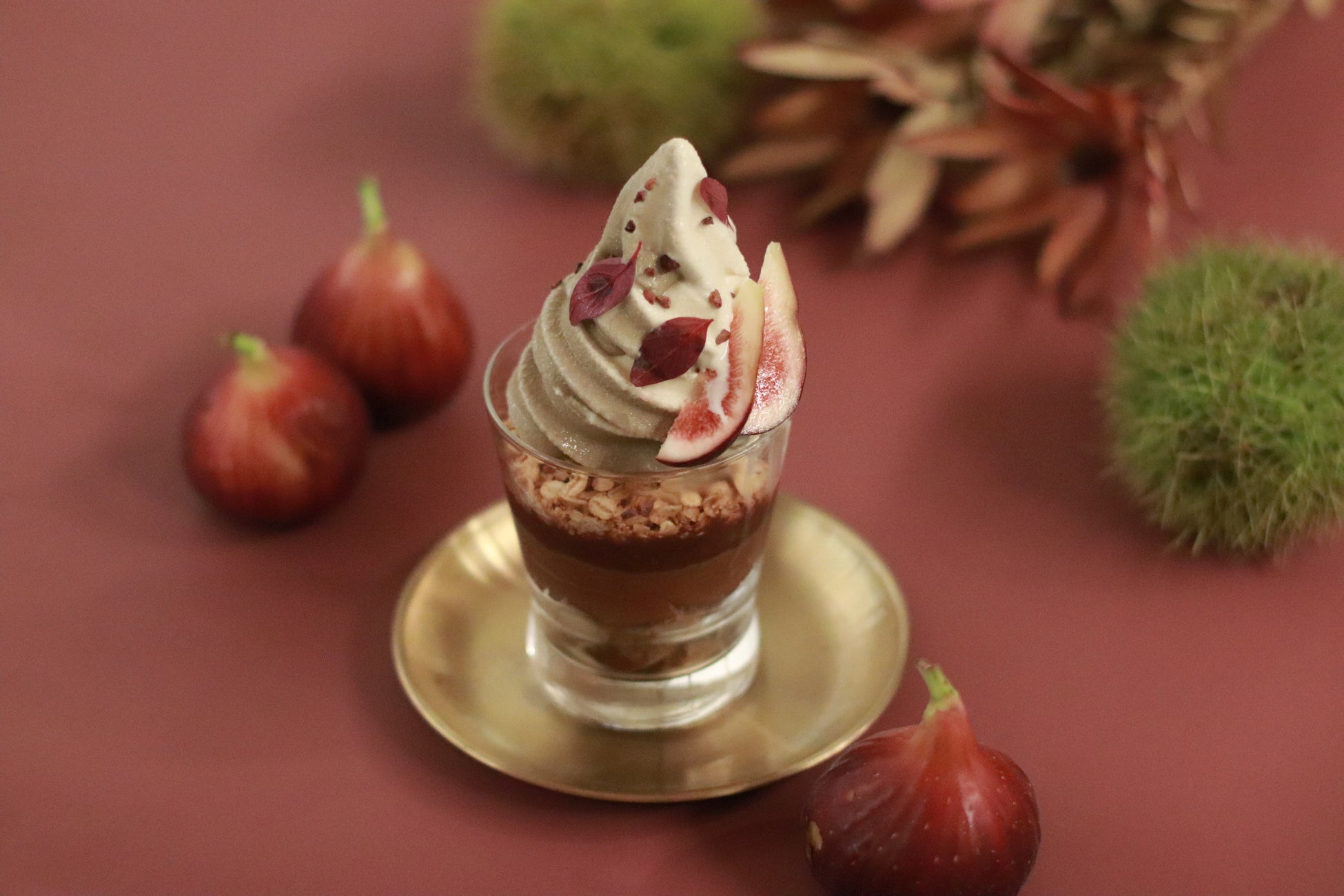 香ばしさ広がる京都産のほうじ茶を贅沢に使用した有機豆乳と甘酒の自家製ヴィーガンソフトクリームに大麦のグラノラ、フルーティーないちじくのピュレ、濃厚な栗のペースト、アールグレイ茶葉を使用した米粉の手作りスポンジケーキをグラスの中に重ねました。