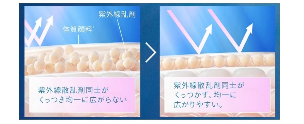 軽さのある紫外線散乱剤と表面加工処理剤の工夫により、紫外線散乱剤が少なくて済むため、高SPFでも白浮きせず、軽い付け心地を実現。