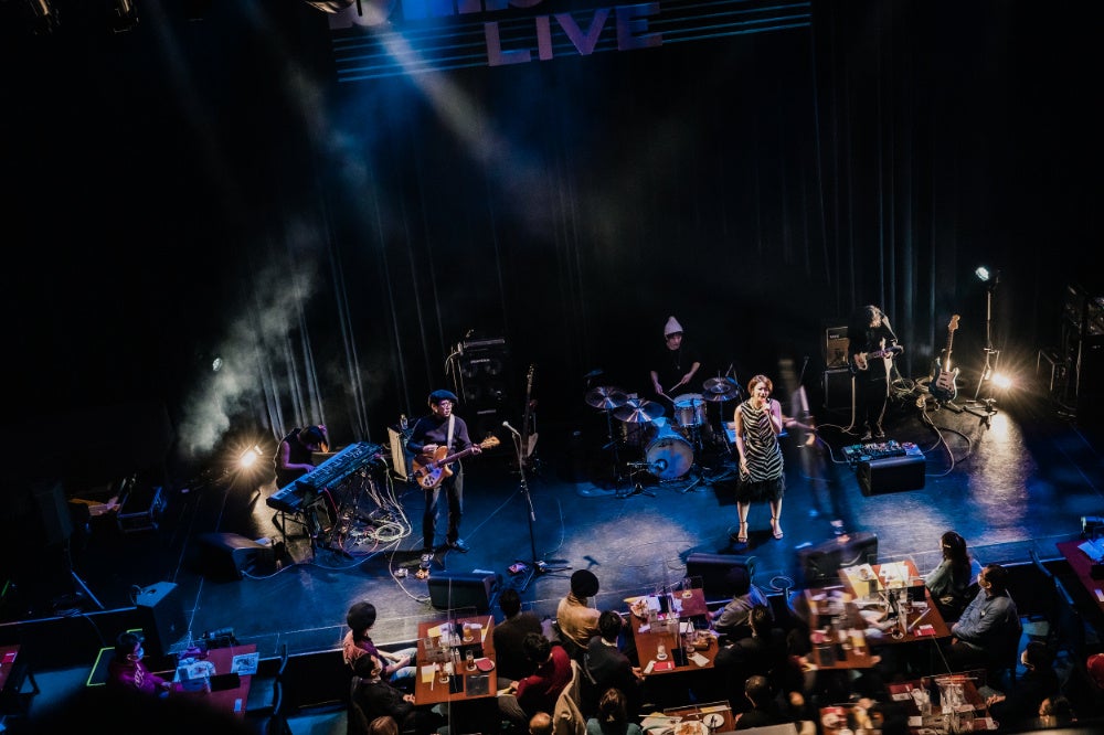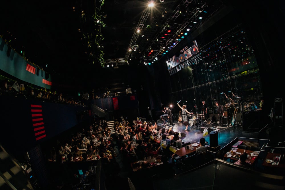 ステージ後方の幕が開くと、巨大な窓から見える東京の夜景をバックにジャジーでソウルフルな「ムーンライト・フラッパー」を届け、新旧トラックを交えて届けたビルボードワンマンを締めくくった。