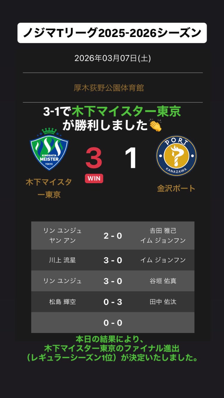 また、本日の結果により、木下マイスター東京のファイナル進出(レギュラーシーズン1位)が決定いたしました。
