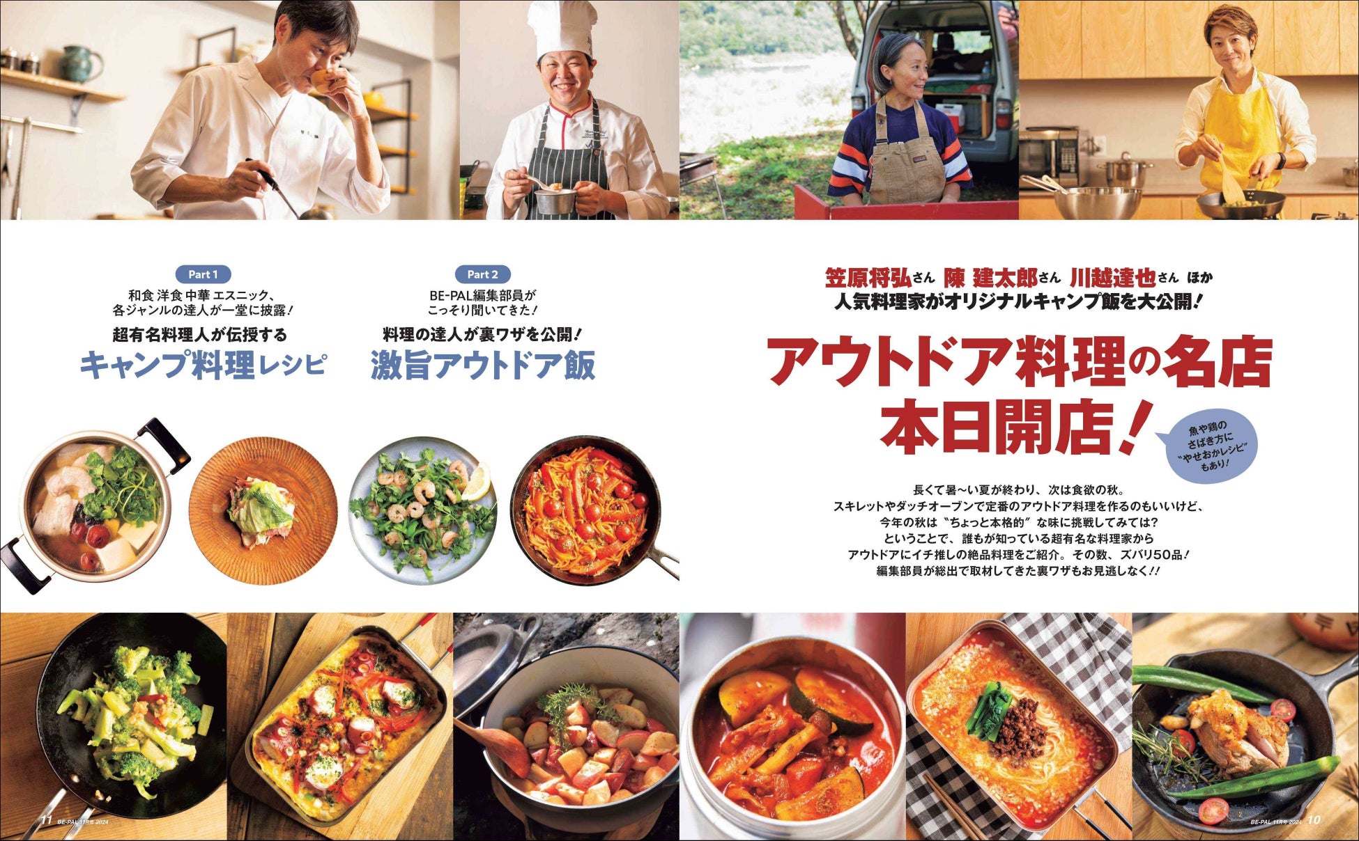 さらに、今号の大特集は「アウトドア料理の名店 本日開店!」。食欲の秋こそ、快適でごちそう満載のキャンプへ行きたい~! ということで、有名料理家にアウトドアでも役立つ料理のコツを聞いてきました。賛否両論の笠原将弘さん、四川飯店の陳建太郎さん、そしてイタリアンの川越達也さんなどなど。この特集を読めば、料理の腕が爆上がりすること間違いなし!