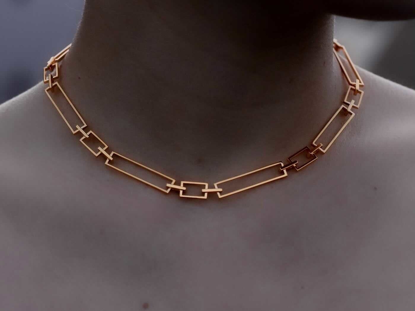 オリジナルデザインのスクエアタイプのチェーンが、クールな印象を与えてくれます。日常使いもしやすく、コーディネイトにエッジが効くおすすめのジュエリーです。