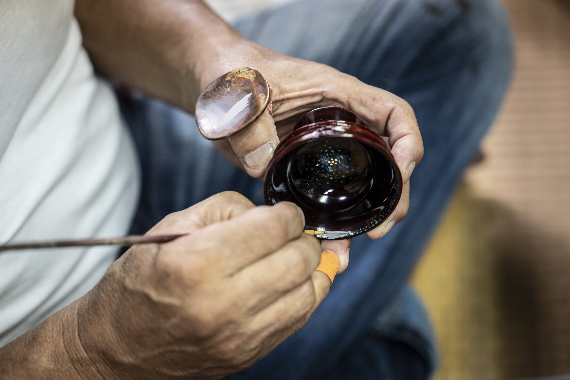堅牢な塗りと加飾の優美さを特徴とし、日本を代表する漆器として高く評価されている「輪島塗」。およそ1000年の歴史をもつといわれ、国の重要無形文化財にも指定されています。地元で産出した珪藻土を粉末にした「輪島地の粉」を下地に使用し、代表的な加飾方法として蒔絵と沈金が挙げられます。蒔絵は、漆で絵柄を描き、硬化する前に金粉などを蒔きつけ固着させます。沈金は、漆の表面に沈金ノミで文様を削り、その溝に漆をすり込み、金箔や金消粉を入れる技法です。