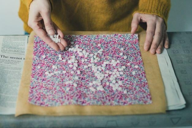まず、アイロン台に新聞紙、クッキングシート、布を順に重ね、みつろうを散らします。