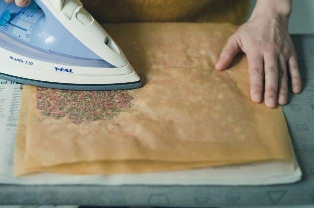 上にクッキングシートを重ね、アイロンでみつろうを溶かし、布にしみ込ませます。