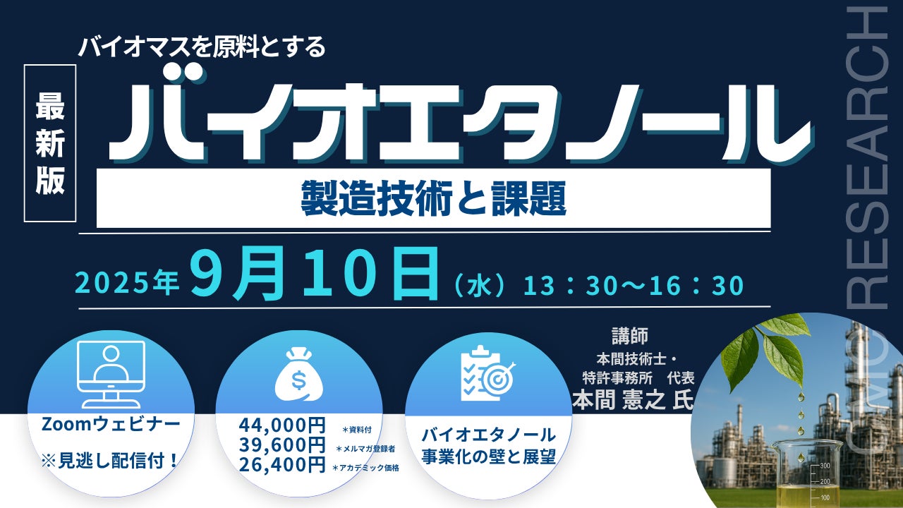 【ライブ配信/Zoom】「バイオマスを原料とするバイオエタノール製造技術と課題」セミナー開催!9月10日(水)主催:(株)シーエムシー・リサーチ