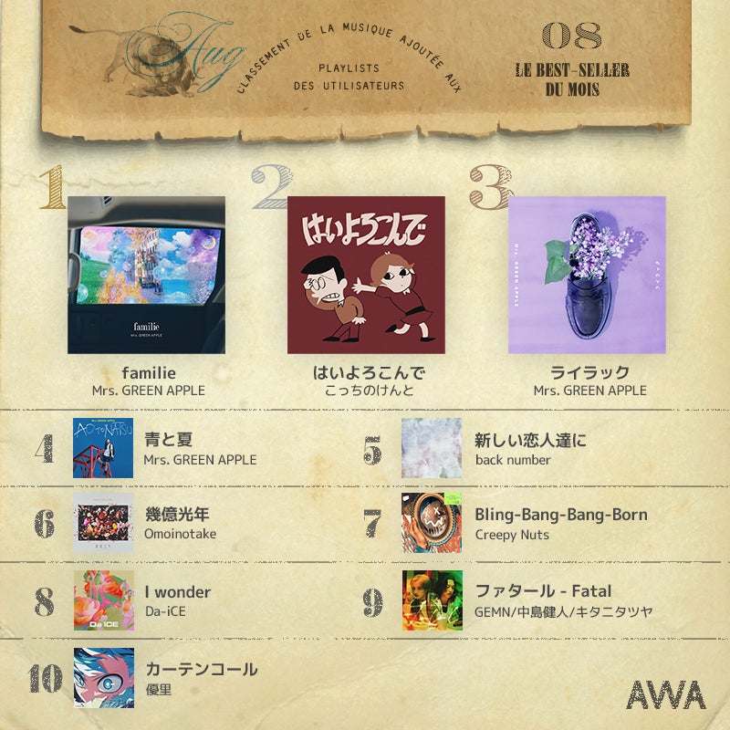 Mrs. GREEN APPLE最新曲「familie」が初登場1位を獲得!SNSで話題沸騰中のこっちのけんと「はいよろこんで」など〜2024年8月度のAWAプレイリスト採用楽曲ランキングを発表〜