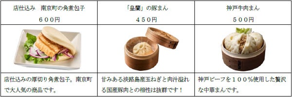 淡路島産玉ねぎと国産豚肉にこだわった創業当初から大人気の豚まんや自家製角煮包子、伝統の中華そばなど、様々なメニューをご用意しています。本場中華街の味にご満足いただけること間違いなし!この機会に是非ご賞味ください。販売メニュー等の詳細は、次のとおりです。