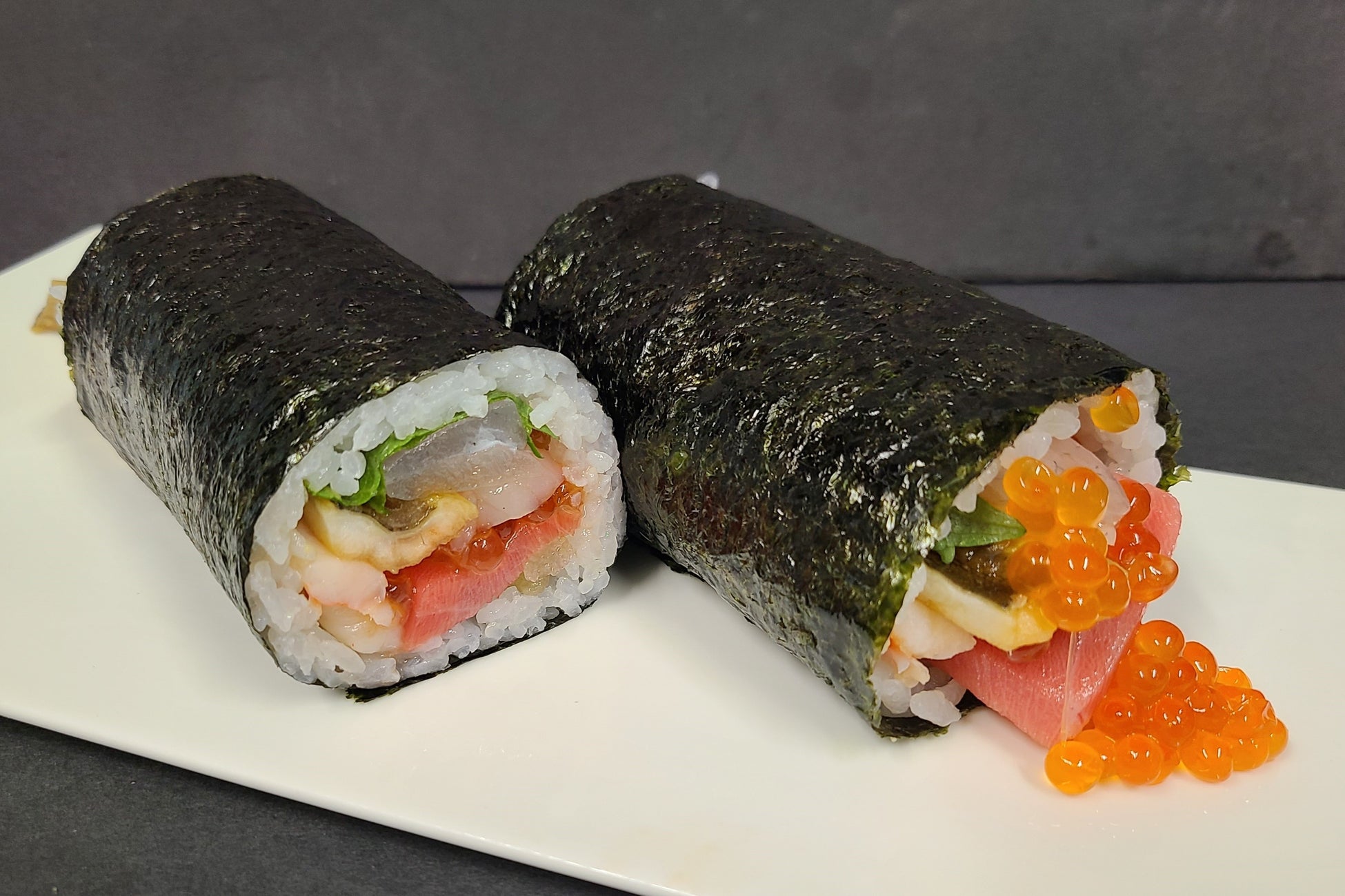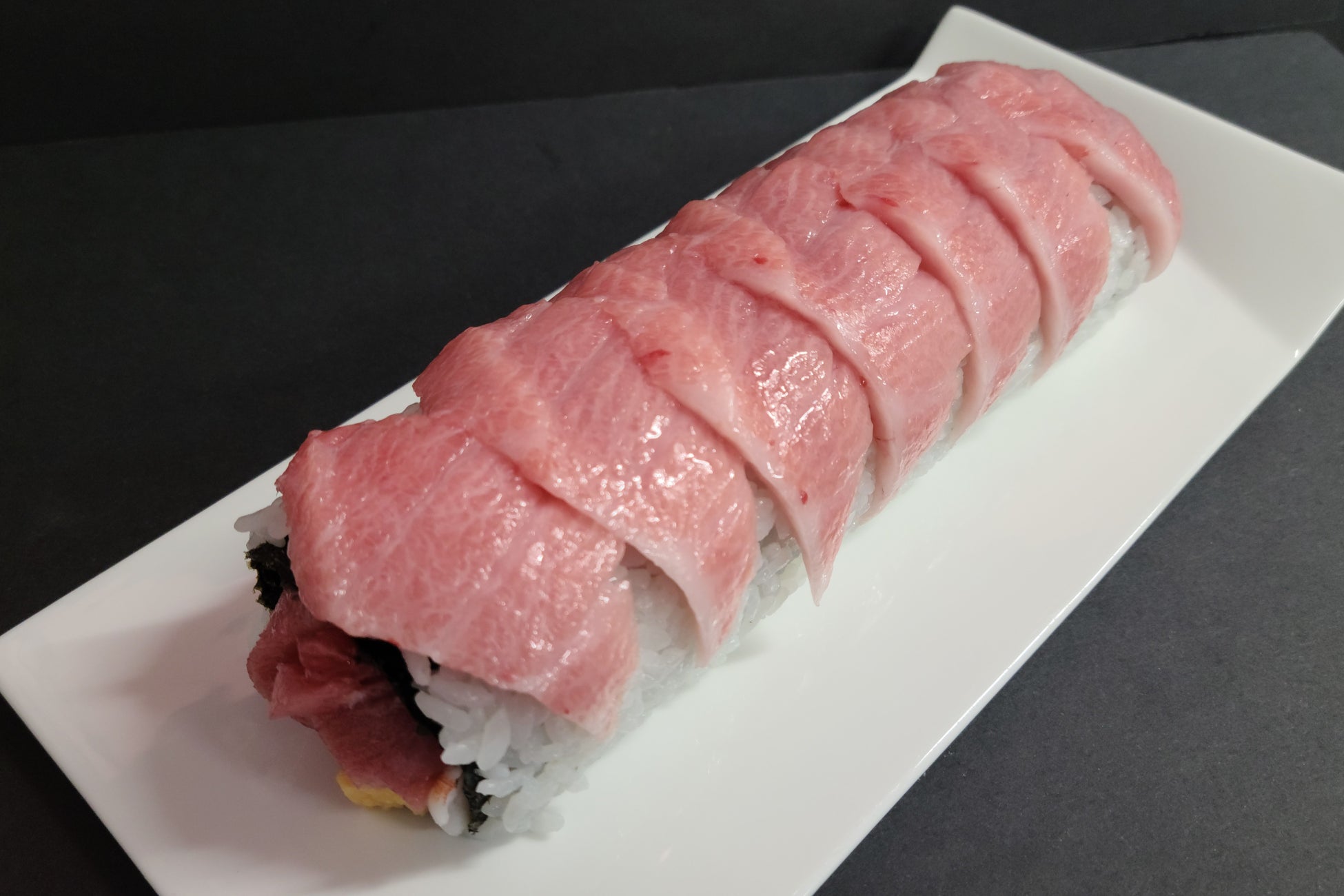 本マグロをたっぷり入れた巻きずしの上に大トロをふんだんにのせた贅沢な1本!