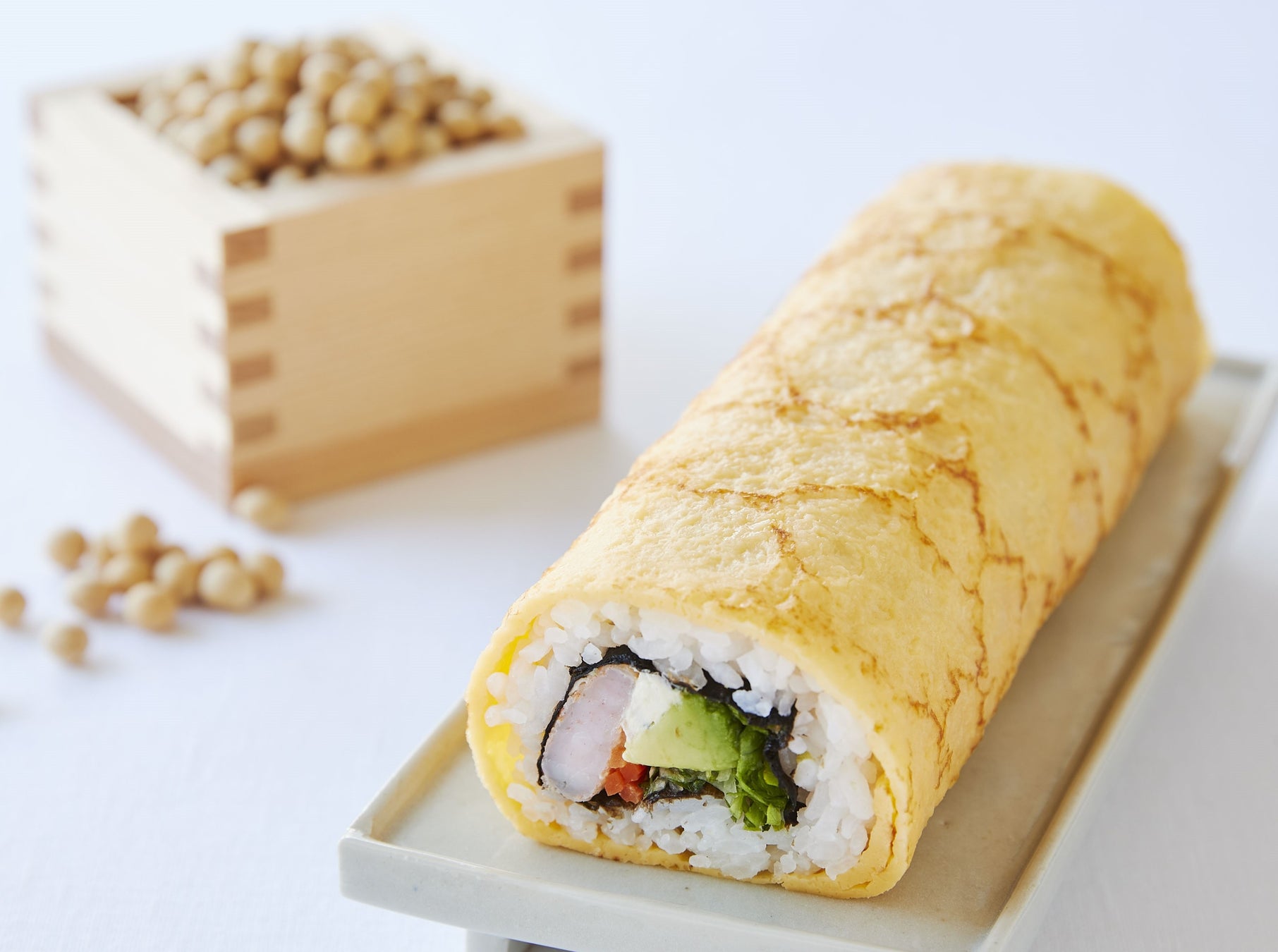 海老・アボカド・クリームチーズを、甘みのあるふんわりした薄焼き玉子で包みました。千切りにした生野菜と人参ナムルの食感も楽しい、“サラダ恵方巻き”です。