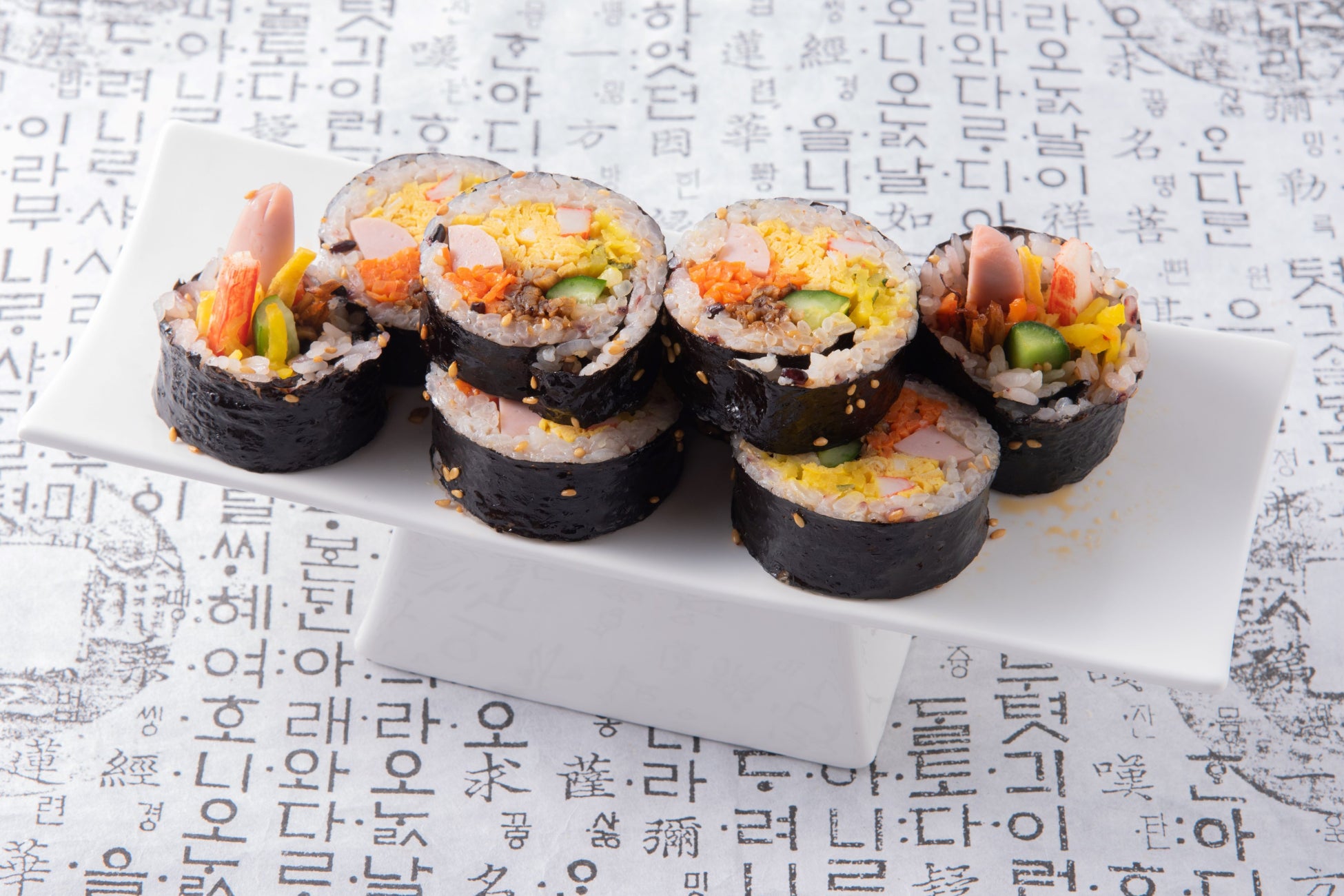ごはんと、さまざまな具をたっぷり入れ韓国のりで巻いた韓国風ののり巻き。食べ応え抜群な本場の味わいを。
