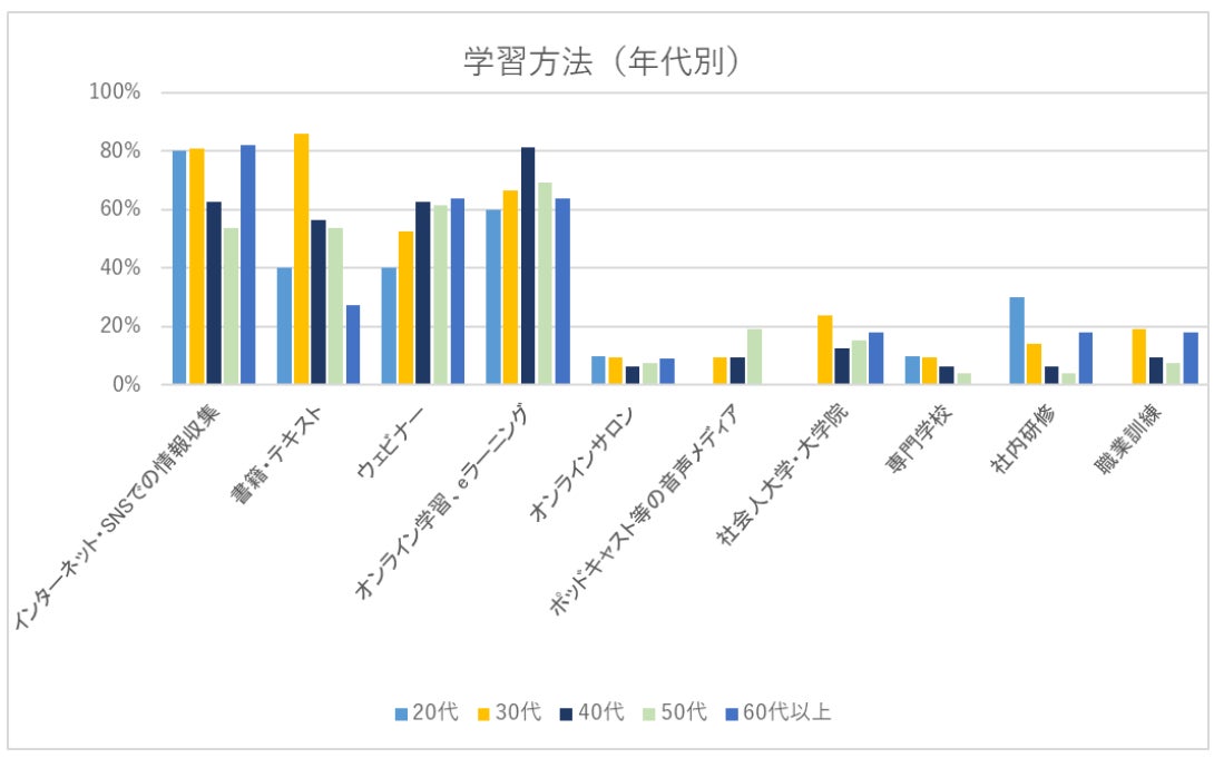 40代・50代回答者の間でポピュラーな学習方法は「オンライン学習、e-ラーニング」、次が「ウェビナー」。