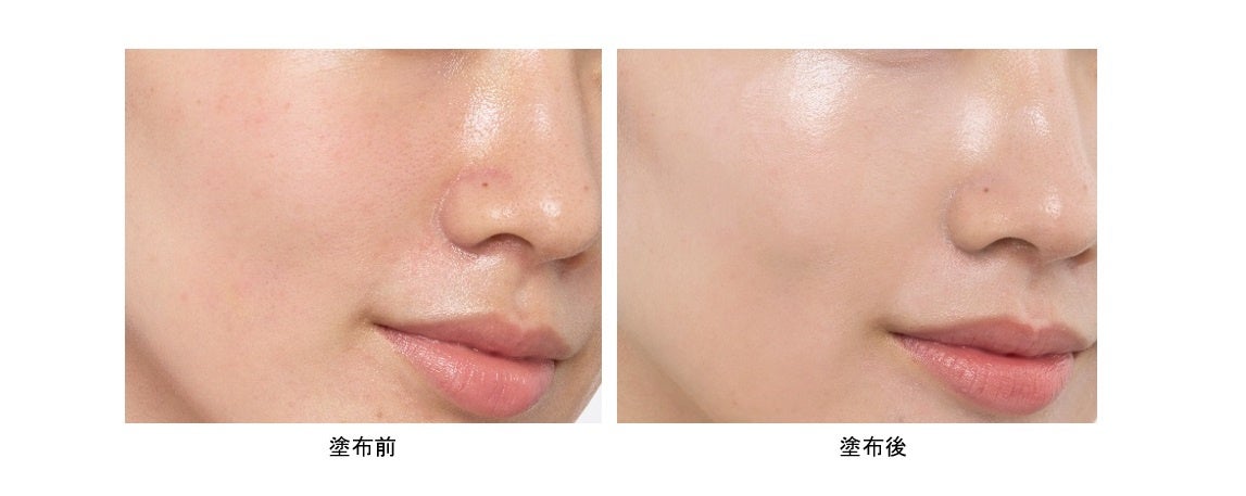 また、1日中※2つけたての美しい仕上がりが続く「毛穴レスつやキープ処方」を新採用。肌の凹凸を補正パウダーではなく、ジェル基材そのもので埋めてくれるため、美容液のようなみずみずしい使い心地でありながら、隠ぺい感なく、毛穴・色ムラをカバーし、自然なつやと透明感を演出します。