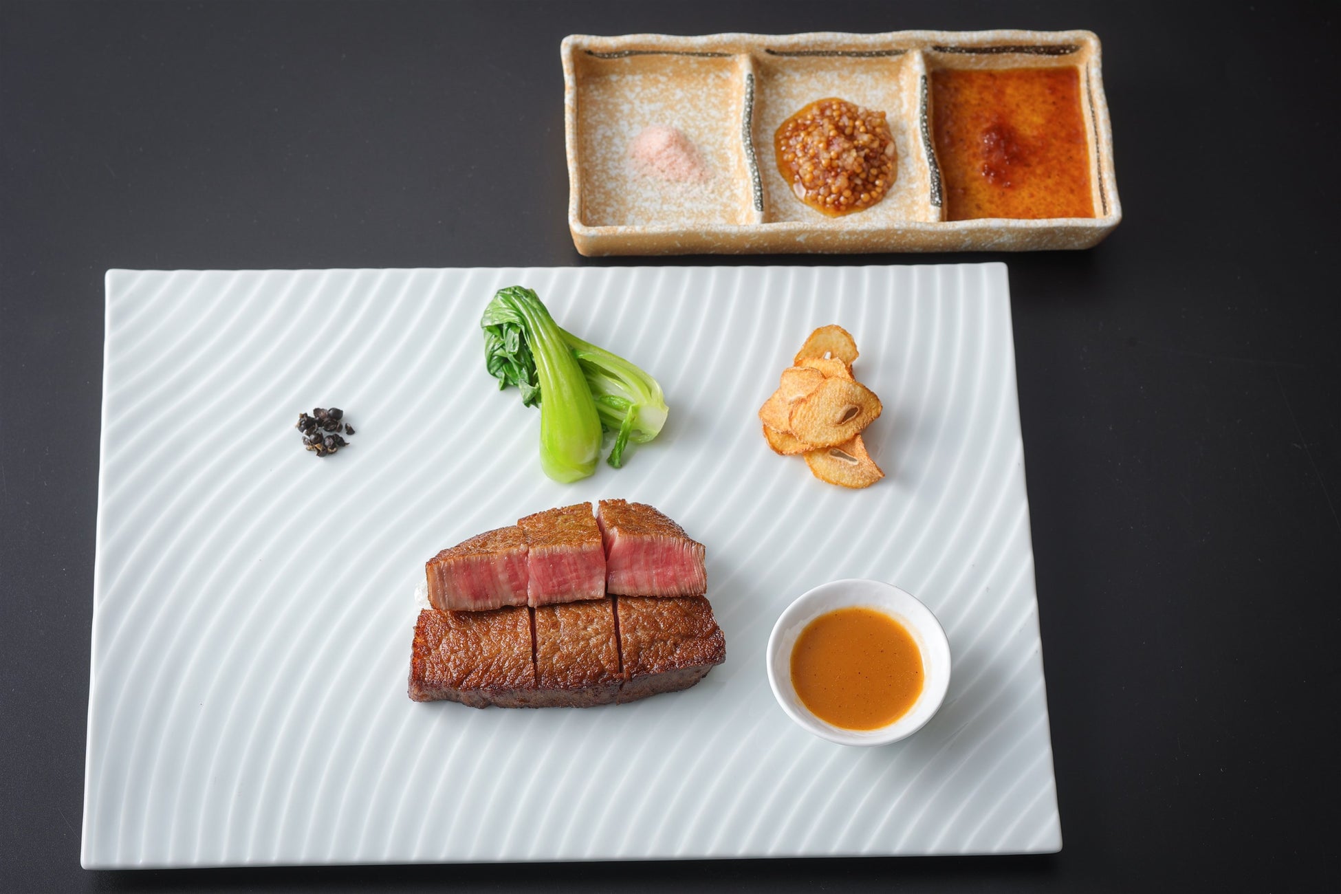 シェフ達が目の前で焼き上げる銘柄黒毛和牛や神戸ビーフ(要差額)などを、伝統のグリーンペッパーソースや奥能登の塩、生胡椒など、こだわりのソース4種類でお愉しみいただけます。また、〆の食事は、栃木県の海老原ファームの野菜をたっぷりと使用した「特製ガーリックライスと厳選ポークリブと海老ベジの豚汁」または、北海道産の柑橘風味の生ハムの上品な塩味と白桃の甘みがクセになる冷製パスタ「完熟トマト、白桃、北海道生ハムの冷製フェデリーニ」など3種からお選びいただけます。