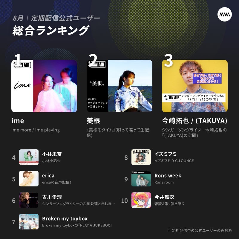 2024年8月度の定期配信AWAラウンジランキングで1位に輝いたのは、emorieでチャンネル開設をしたばかりの歌唱、ピアノ演奏、雑談などの幅広い配信内容で開催しているmikerrとTOSHIKI NAGASAWAの2人によるプロジェクト「ime」。2位には、オルタナティブ・シンガー・ソングライターの「〝美根〟」。3位に、シンガーソングライターの「今崎拓也」がランクインしました。その他、小林未奈、erica、古川愛理、Broken my toybox、ime、今井舞衣が7月に引き続きランクインしました。