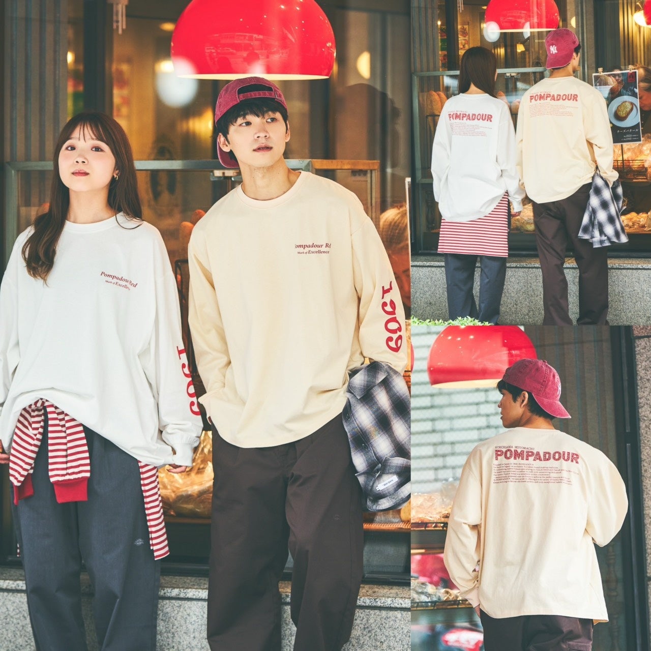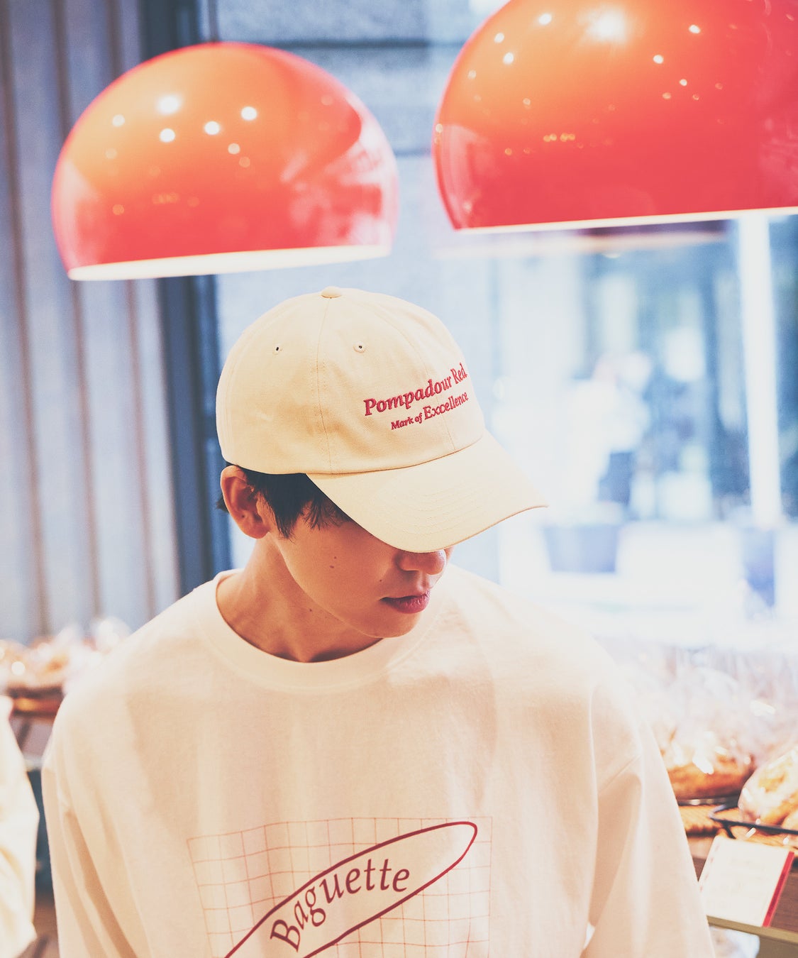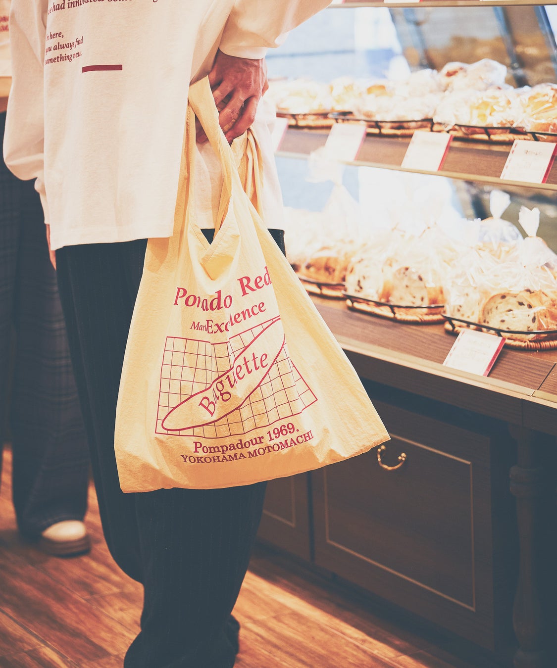 ブランドのキーカラーの赤をロゴにしたシンプルなプリントのデザイン。長年愛され続けるフランスパンのバゲットを、遊び心があるグラフィックで表現しました。いずれも「POMPADOUR Red is mark of Excellence = ポンパドウルレッドは上質へのこだわりを象徴する赤」をテーマに、それぞれのアイテムを作成しました。