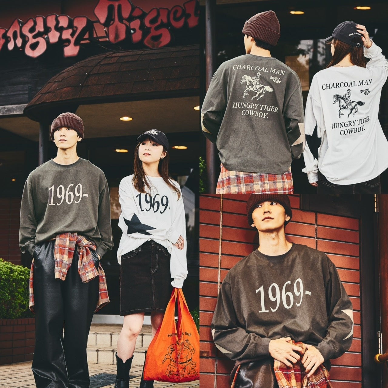 フロントにブランドロゴ、バックにはキャラクターを配置したストレートな表現のデザイン。もう1デザインは、フロントに創業年「1969年」を大きくプリント、バックには調理法へのこだわり(チャコールマン)を表現したデザインの2パターン。