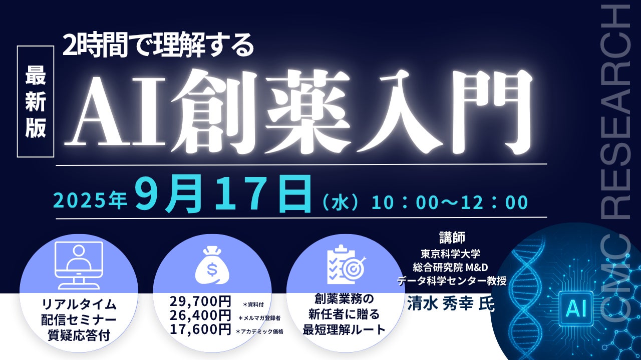【ライブ配信/ZOOM】「2時間で理解するAI創薬入門」セミナー開催!9月17日(水)主催:(株)シーエムシー・リサーチ