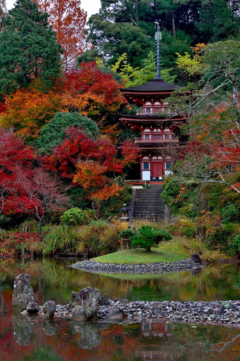屋外の国宝三重塔としては日本最小の「浄瑠璃寺」の三重塔。毎月8日の薬師縁日などで初層に安置されている薬師如来坐像が特別公開される。