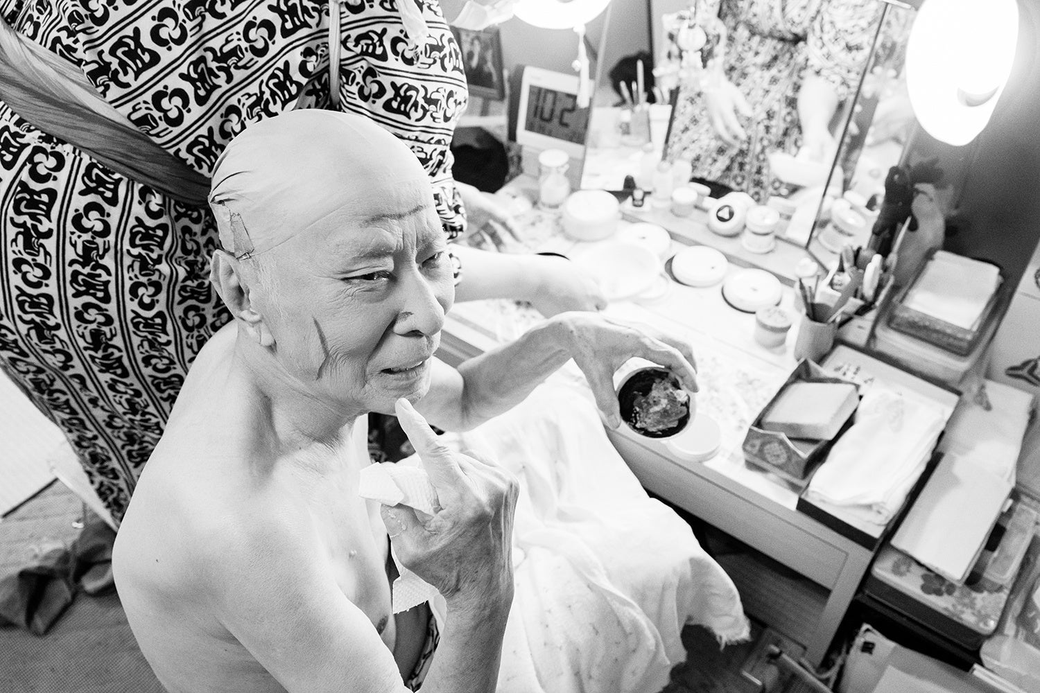 東京・東銀座の歌舞伎座にて、出番を前に楽屋で化粧をする寿猿さん。