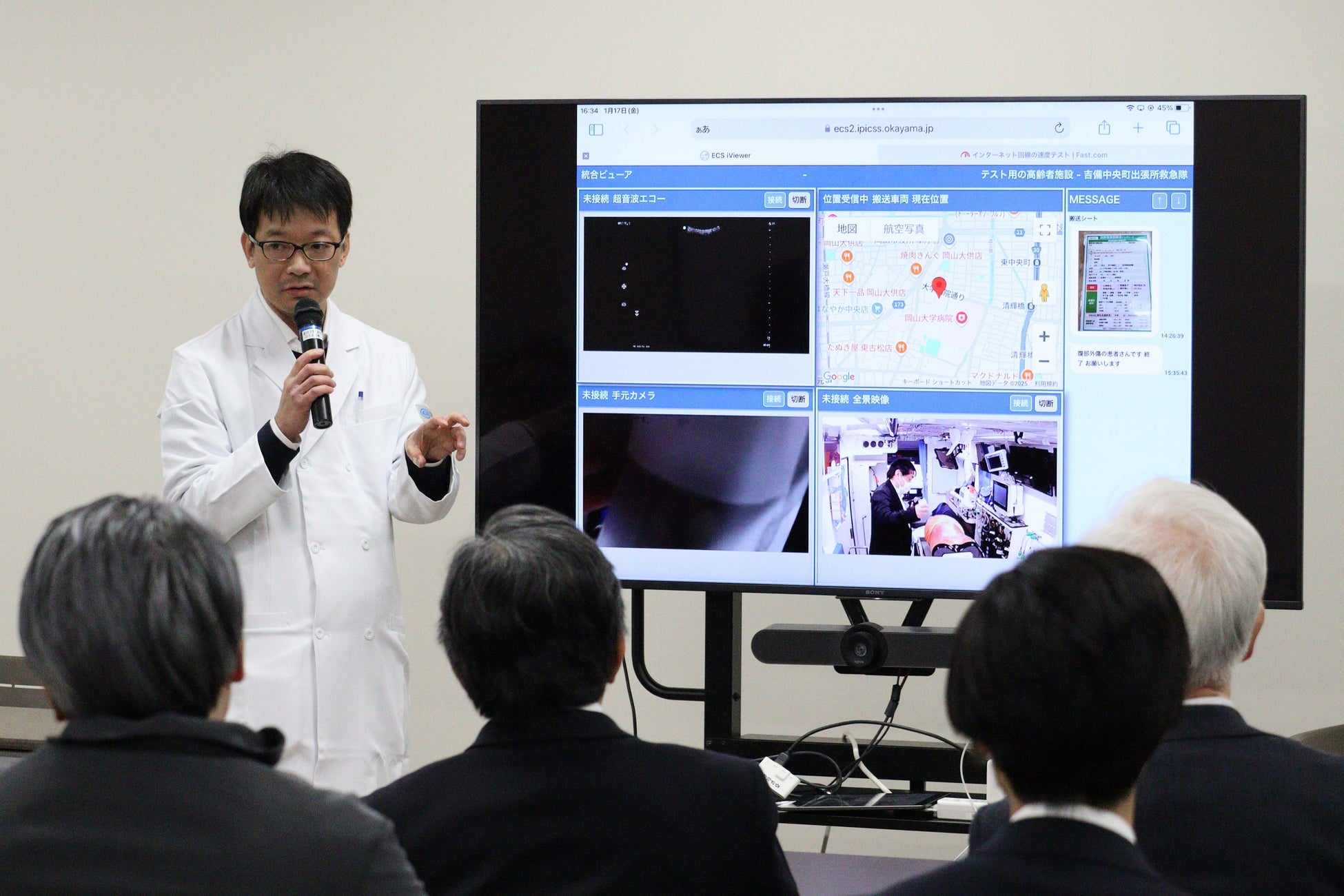 次に鹿田キャンパスに移動し、国家戦略特区「デジタル田園健康特区」に指定されている吉備中央町や「共生型連合体」の取り組みなどを中心としたデジタルの力を活用した医療制度改革と社会変革の取り組みについて説明し、VRを活用したドクターカーの教材や実際のドクターカーの視察を行いました。