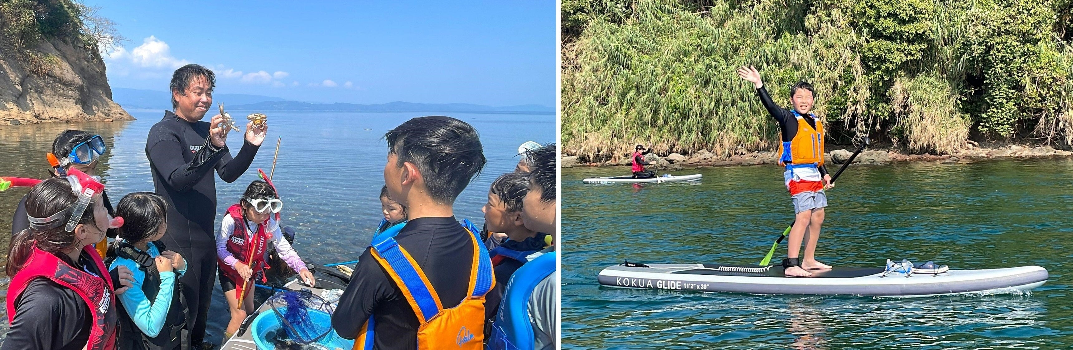 ごみ拾いで二島がきれいになったら、アクティビティ体験のスタートです。午前の参加者はシュノーケリング、午後の参加者はSUPを体験しました。