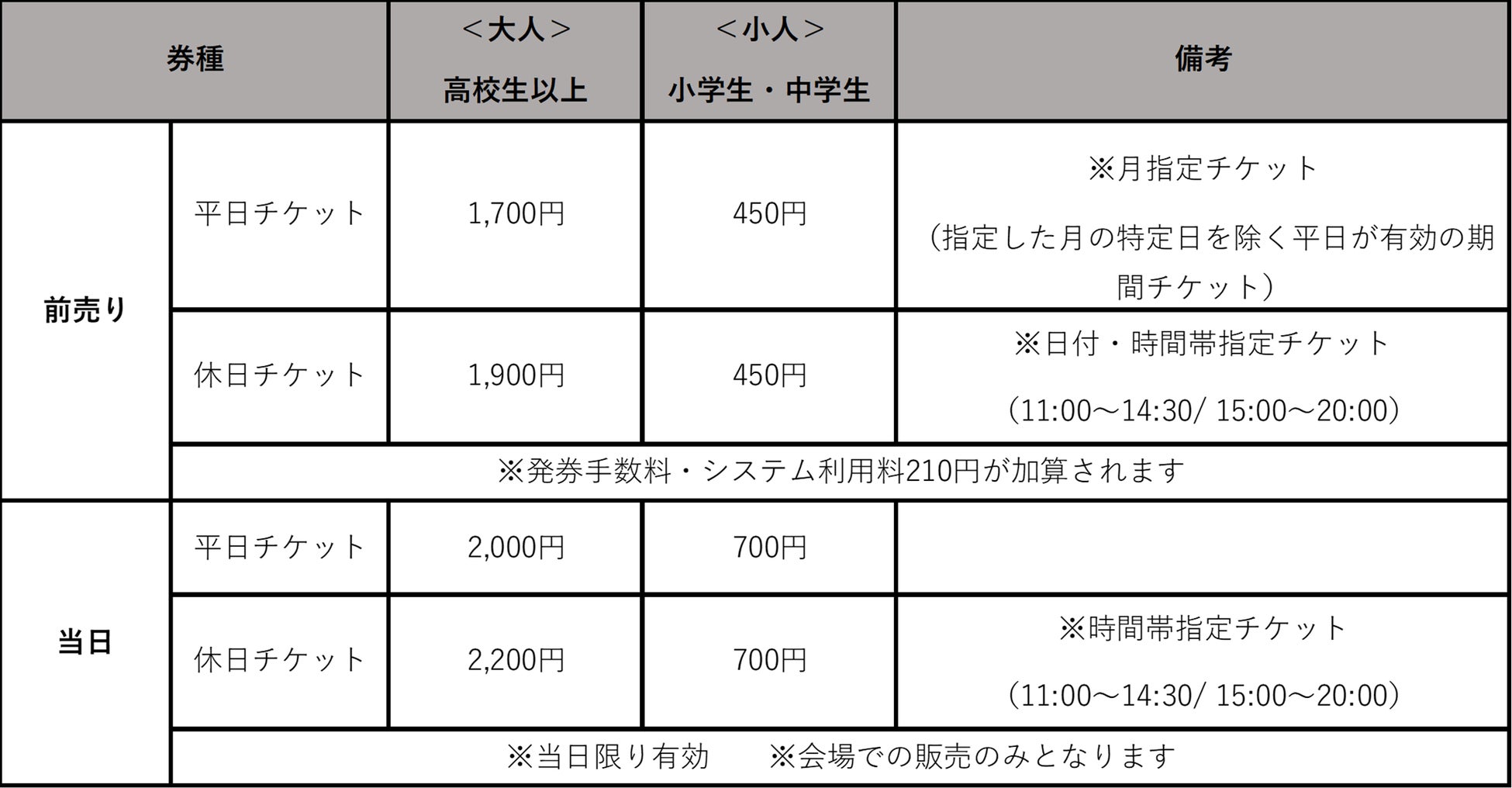 - 営業時間 :11:00~20:30 最終入場 20:00 ※4月からは 11:00~20:00 最終入場 19:30