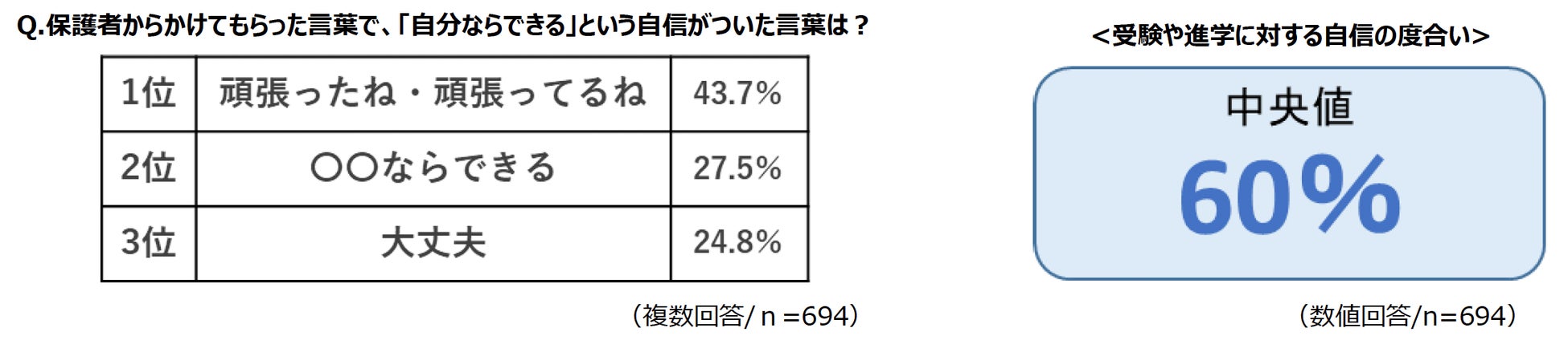 保護者からかけてもらった言葉で自信がついた言葉を聞くと、TOP3は、努力・頑張りを認めてくれる直球の褒め言葉がランクイン。また、「受験・進学に対する、自分ならできるという自信の度合いは何パーセント?」という問いでは、中央値「60%」の結果となりました。