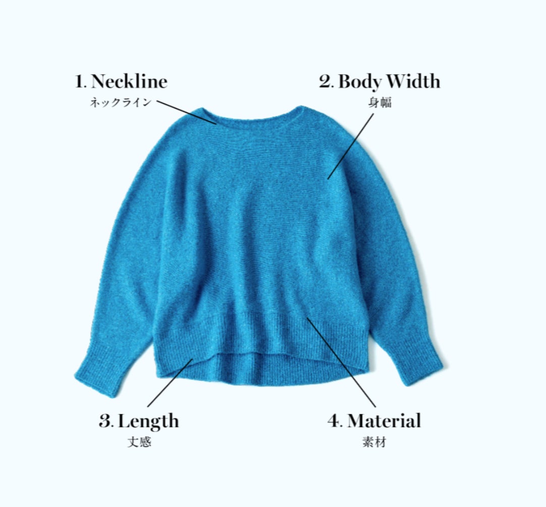 ストレート・ウェーブにはやや短め、ナチュラルには少し長めが好相性。前後差をつけた丈感で、前をインしなくても自然にきまるデザインに。ナチュラルタイプもドルマンシルエットでバランスよく着られる仕上がりです。