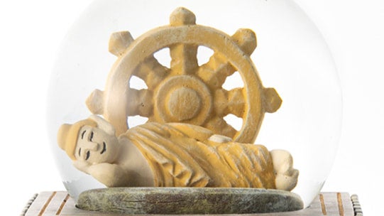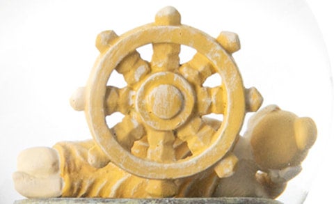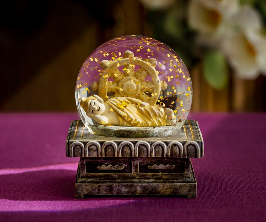 本来、涅槃を表現する仏画や仏像ではこの配置で法輪を表すものはないですが、スノードームの小さな世界の中で「悟りの境地」を表現するために、お釈迦さまの教えの象徴でもある法輪をレイアウトしています。